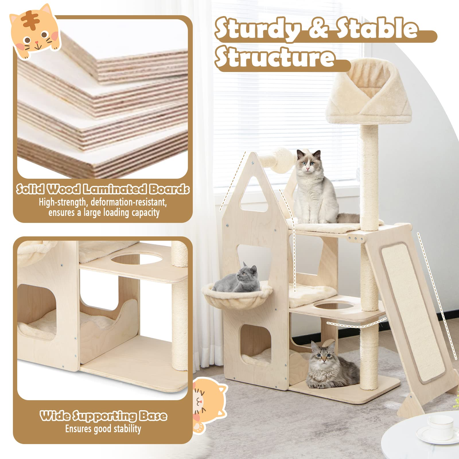 - Sturdy & Stable Structure: The multi-layer cat tree is made of a solid wood multilayer board, which is high-strength and deformation-resistant, ensuring a large loading capacity. And the boards with fine polishing treatment ensure safety. In addition, it is supported by a wide and stable base, so it would not wobble or tip over easily.