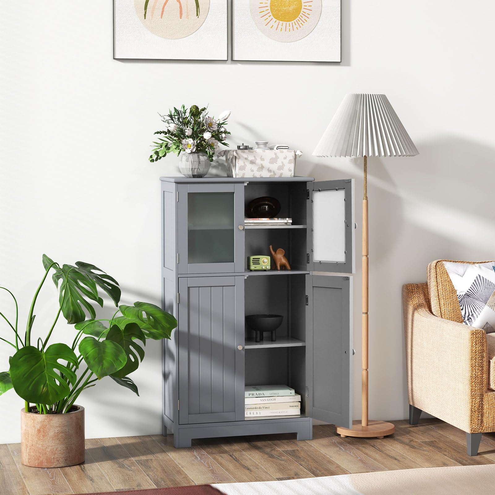 • Keep Your Home Neat & Tidy: This floor cabinet provides ample space to store various items like bathroom supplies, aromatherapy, crafts, books, spice jar, or other stuff, making them well organized. In addition, the lower inner shelf can be adjusted to 3 positions to provide flexible storage space for items with different heights.