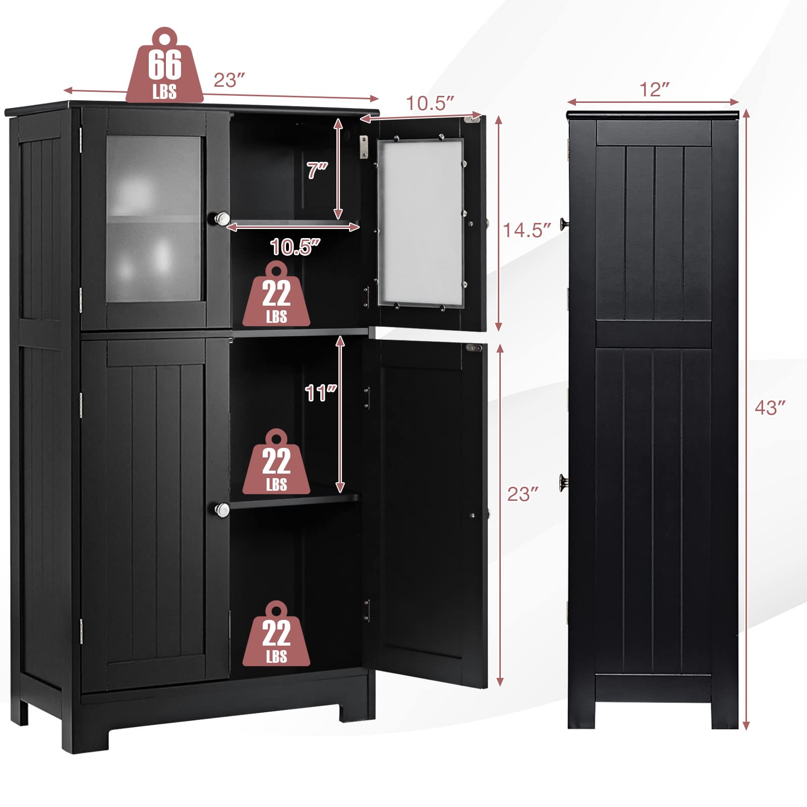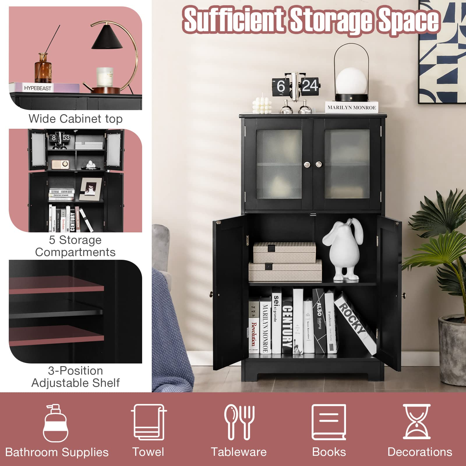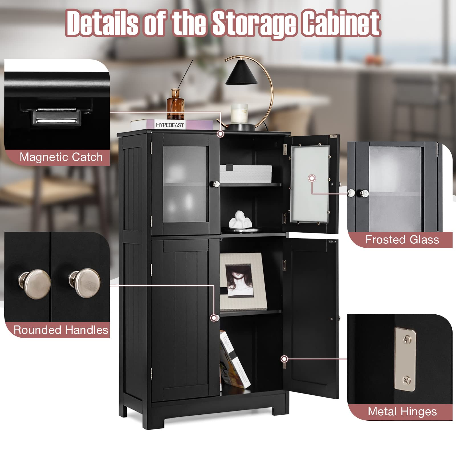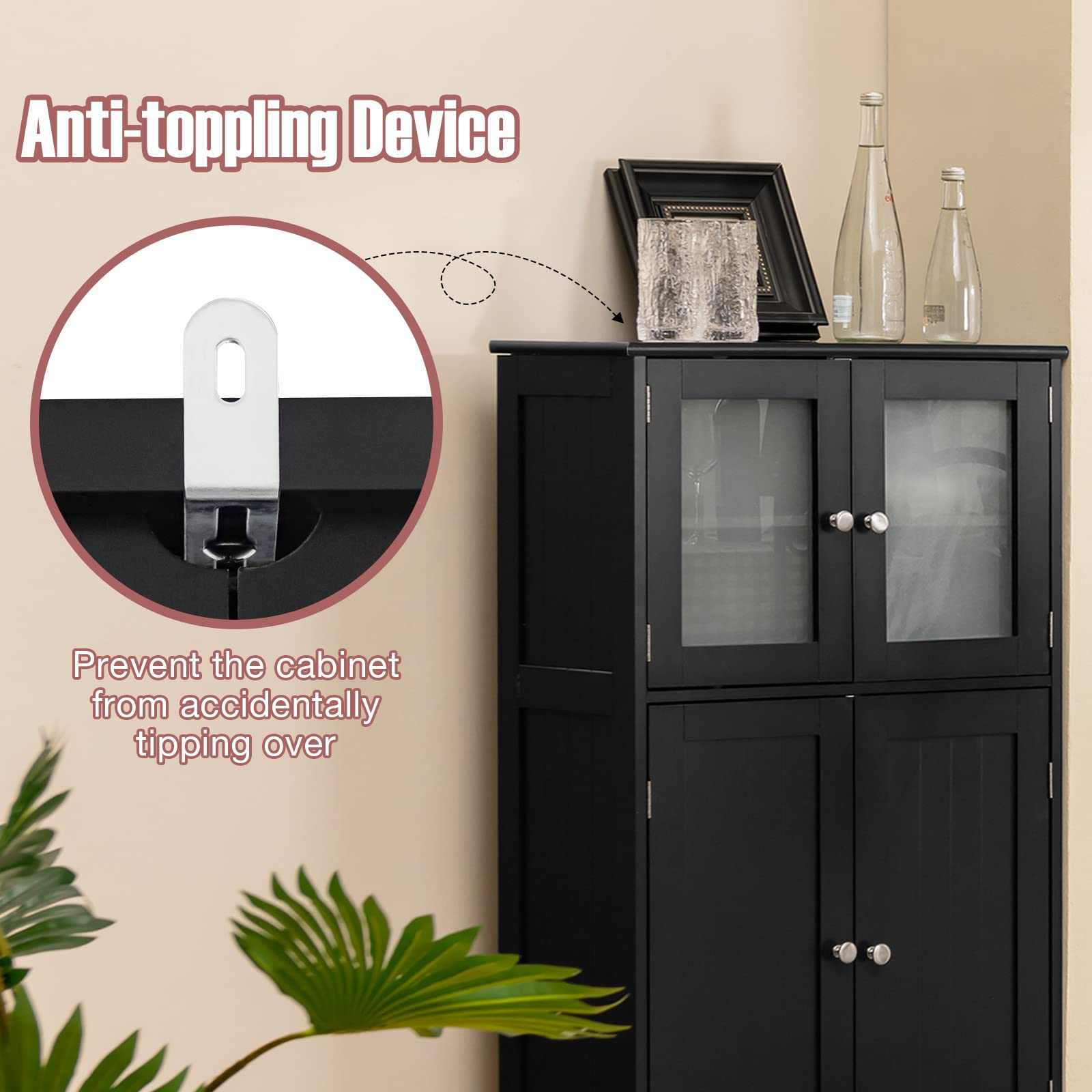 • Premium & Durable Materials: Made of high-quality MDF and sprayed with waterproof paint, this floor cabinet can ensure great sturdiness for long-lasting use. Besides, the frosted tempered glass doors are not easily broken and can keep your items not be seen.