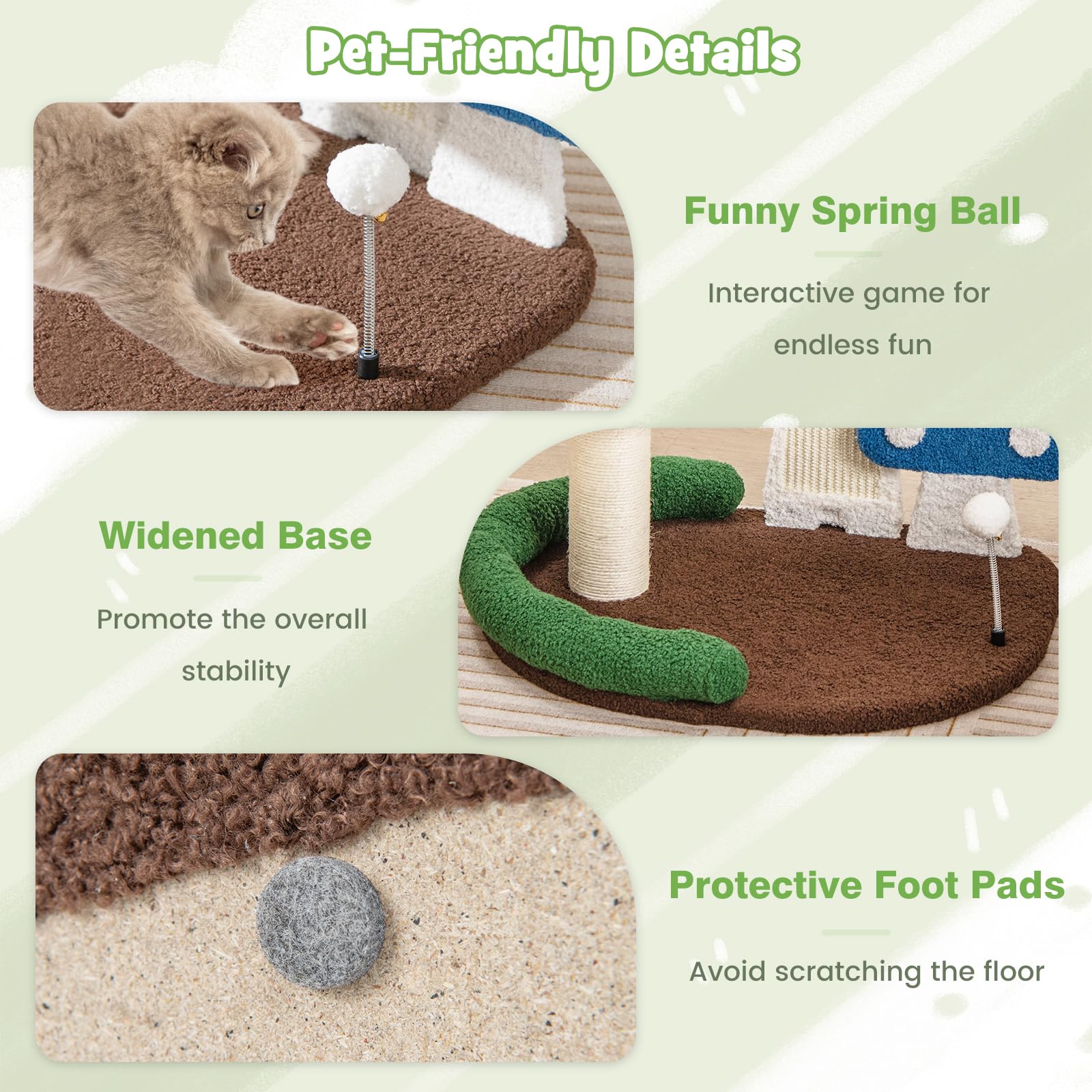 Give your furry friend the ultimate relaxation and play zone with our thoughtfully designed cat tree. With a comfortable condo for resting and a wide platform for observation, your cat will feel right at home. Its full-wrapped sisal post and added scratching board satisfy your cat’s natural instincts and protect your furniture from scratches. Covered in ultra-soft teddy fabric and featuring sponge padding, our cat tower provides optimal comfort and prevents any impact injuries. With more pet-friendly details, the stable wooden structure with an enlarged base and anti-slip foot pads will ensure great stability. And to add a touch of whimsy, our cat activity center boasts a cute cartoon mushroom design, creating a fun and imaginative environment for your beloved feline friends.