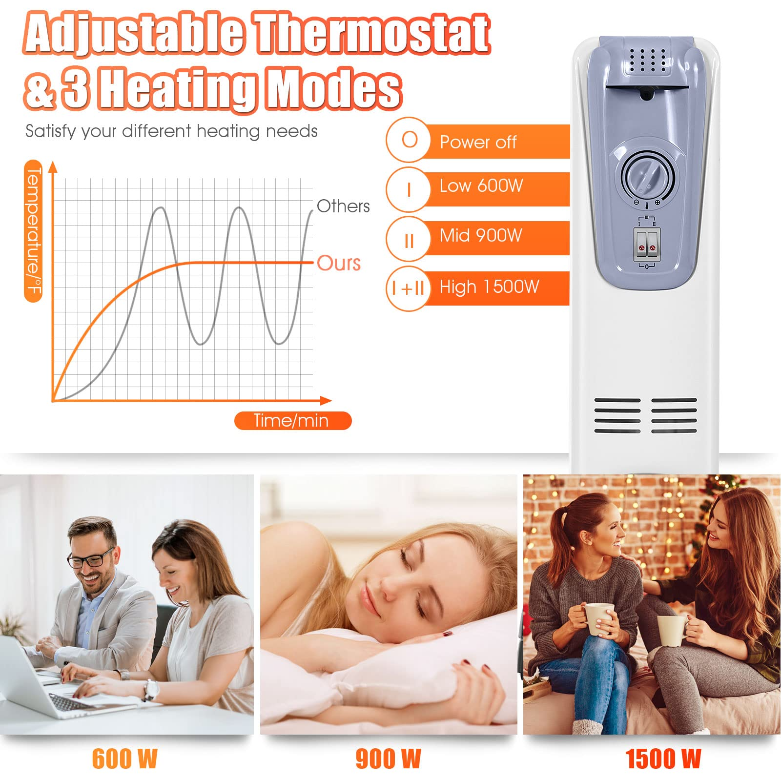 This easy-to-operate oil-filled radiator heater features 3 heat settings (low, medium, and high) and an adjustable thermostat to provide energy-efficient and constant heat for your home and office