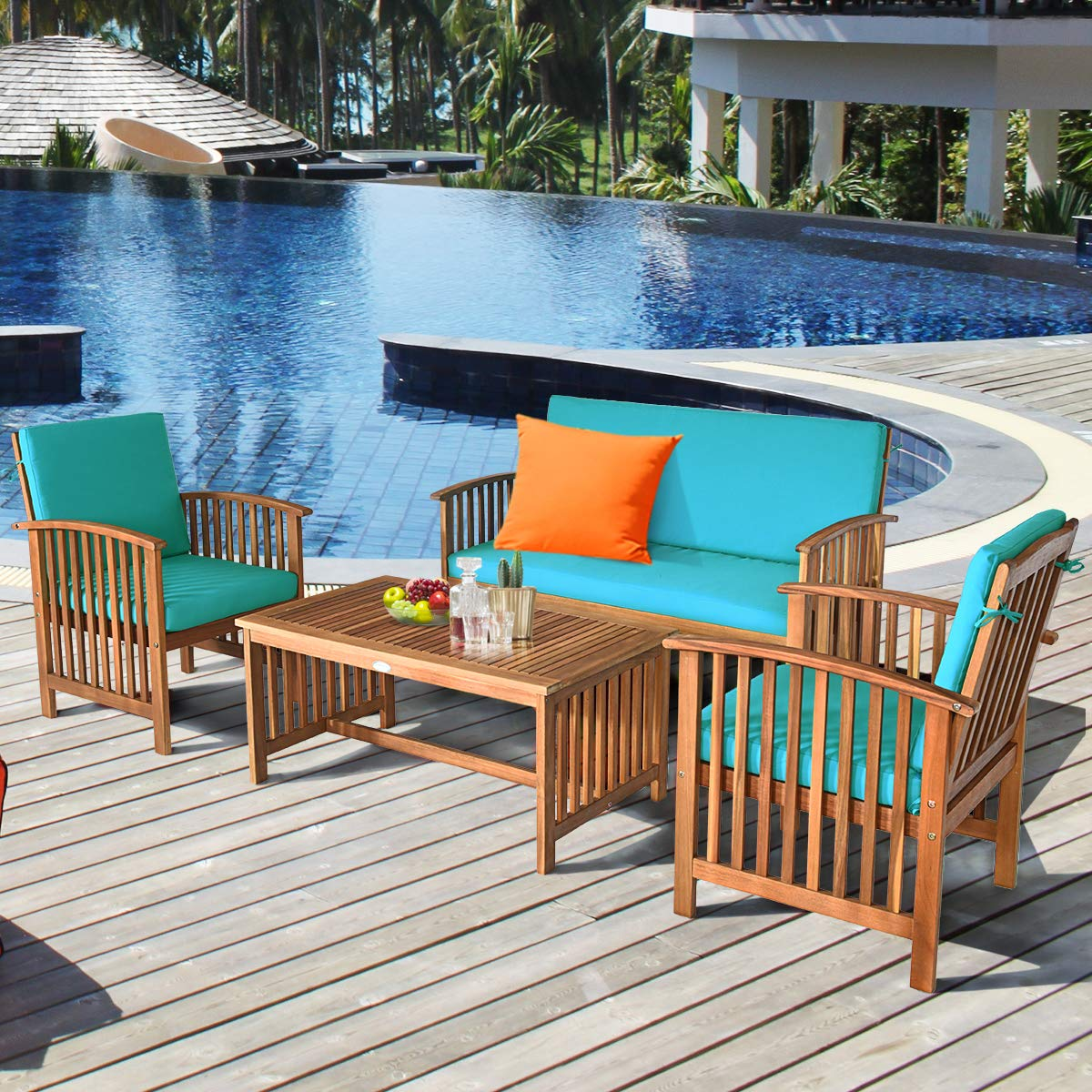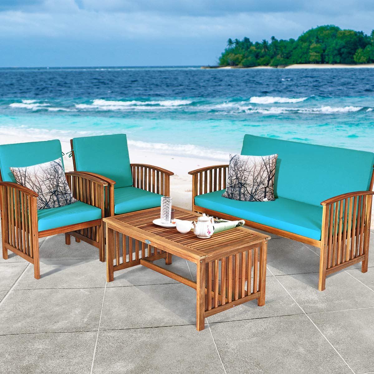 This 4-piece wooden sofa set with a concise style is ideal to be placed in your patio or garden. Made of premium acacia wood, the whole frame is sturdy and not easy to crack or deform. All the single chairs and loveseats are equipped with soft and high-resilient cushions for seats and backrests. You will get excellent comfort if you sit on the sofa. In addition, the zippered cover can be removed conveniently for rinsing. Each piece of our set is independent so they can be rearranged based on your preference. Comes with a coffee table, and you can put drinks, snacks, magazines, and fruits. Please enjoy your leisure time with your friends or family on your balcony, garden, or backyard.