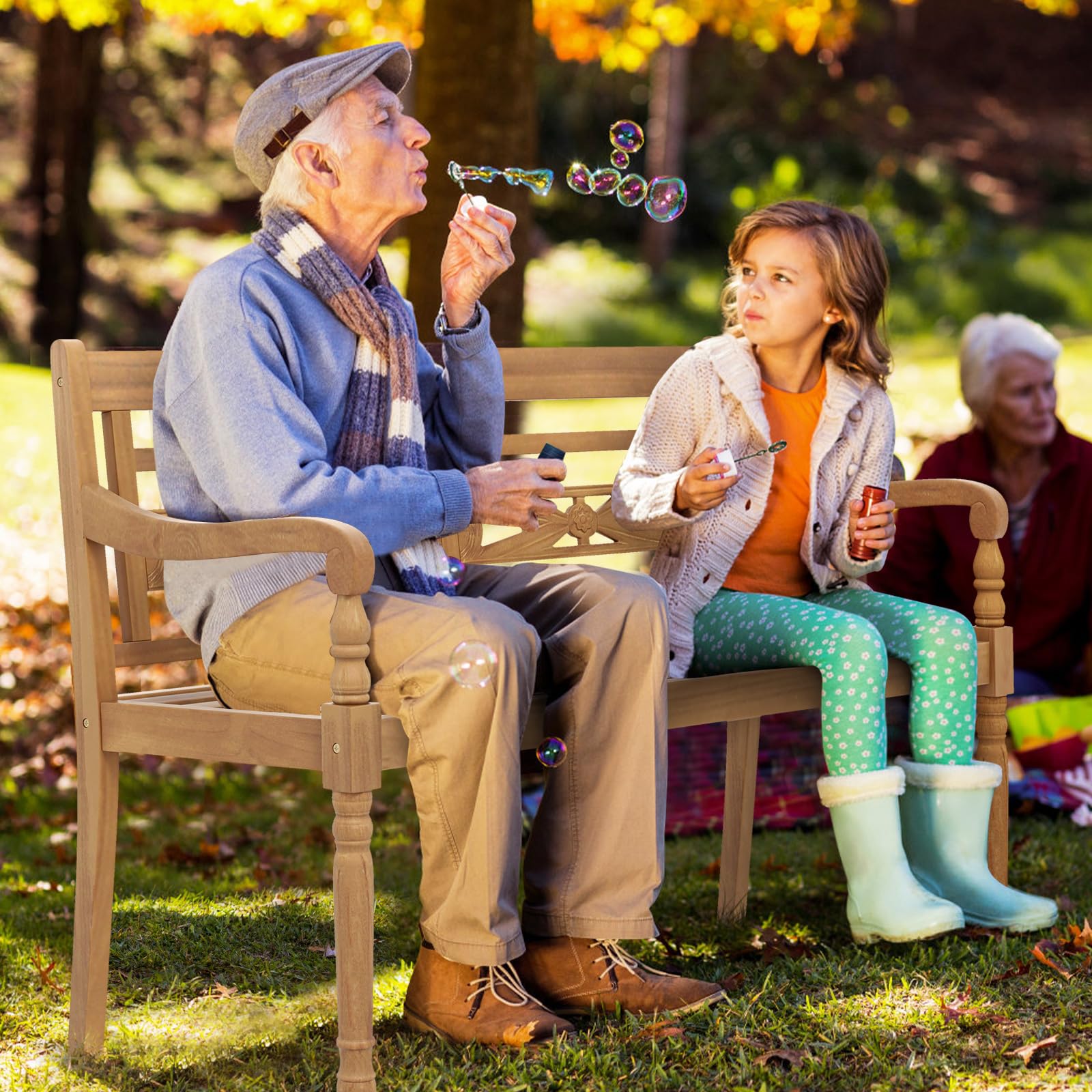 Crafted from solid teak wood, this garden bench exudes timeless elegance and natural beauty, making it a great addition to any outdoor space. The ergonomic design of this bench ensures maximum comfort, featuring a spacious backrest, curved armrests, and seat. With a strong weight capacity up to 660 lbs/300 kg, this garden bench is perfect for 2 people to enjoy their outdoor leisure time together. Whether placed on your front porch, backyard, patio, or garden, this outdoor bench effortlessly complements existing furniture, elevating the overall aesthetic of your outdoor oasis.
