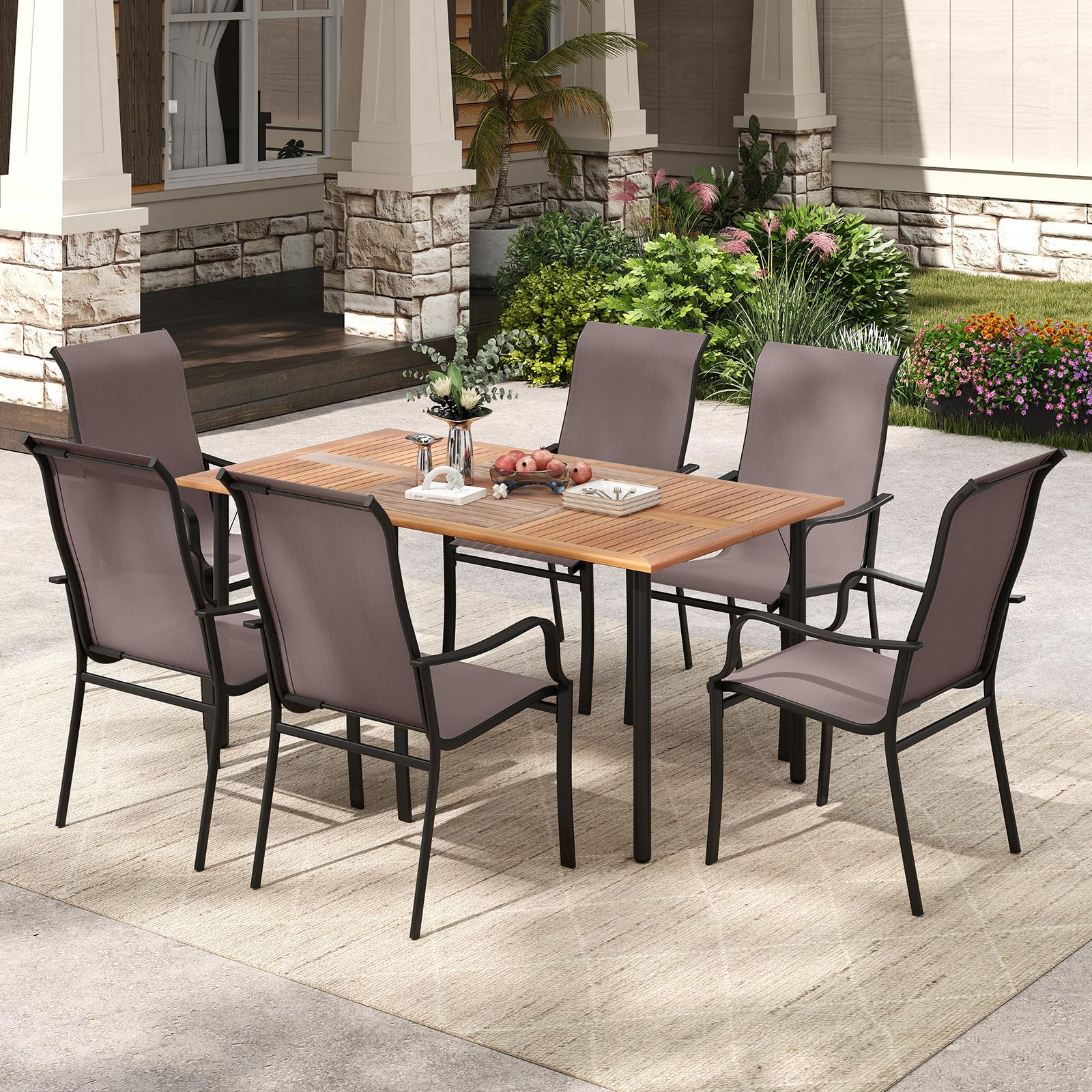 These patio dining chairs combine streamlined elegance and versatile use, applicable to various outdoor settings such as porch, garden, backyard and poolside. They are crafted from thick metal pipes with reinforced connection and firm legs, also woven with tear and fade resistant fabric, ensuring prolonged service life for your peace of mind. Plus, the fabric is breathable and fast-drying for a feeling of coolness. Meanwhile, these outdoor dining chairs boasts high backs with head support and curved armrests for ergonomic comfort without fatigue even after hours of seating.