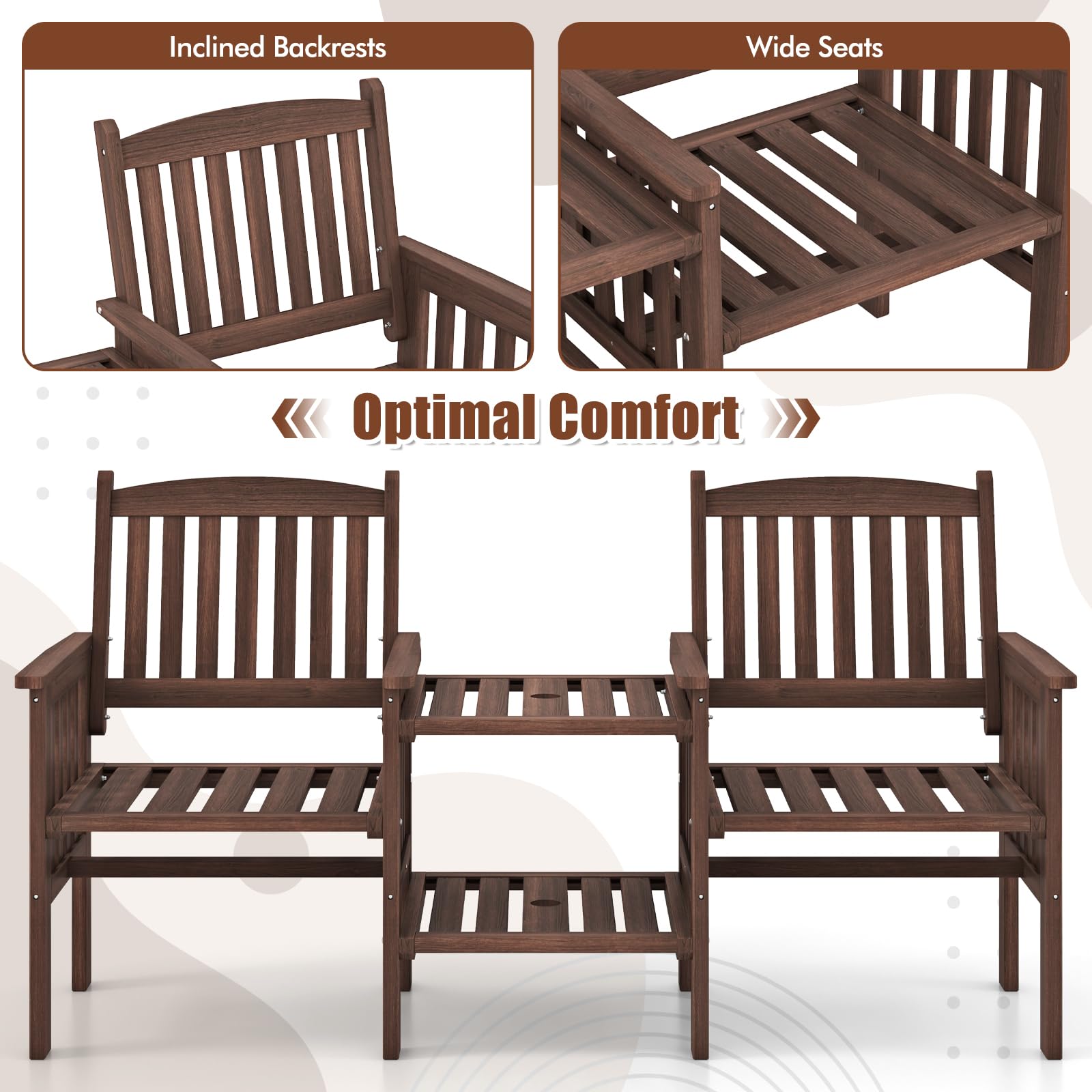 Tangkula Outdoor Fir Wood Loveseat with 2-Tier Side Table and Umbrella Hole