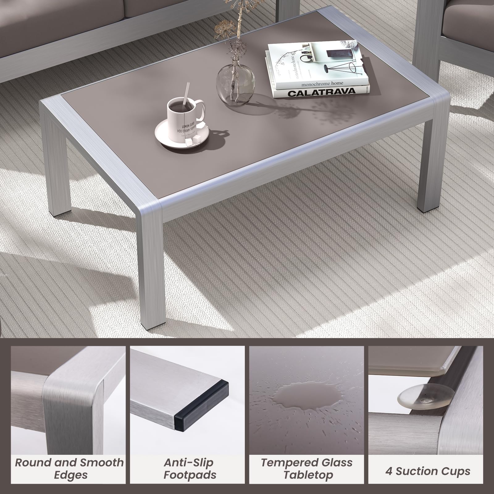 Crafted with a robust aluminum frame, this table stands up to the elements, making for years of enjoyment. The tempered glass tabletop not only adds a touch of elegance but also provides a reliable surface for your leisure activities. Measuring 40 inches, it offers ample space for your refreshments and decor. Its versatile modern design effortlessly complements any backyard, garden, or poolside setting. Choose this stylish yet practical coffee table to complete your outdoor living environment.