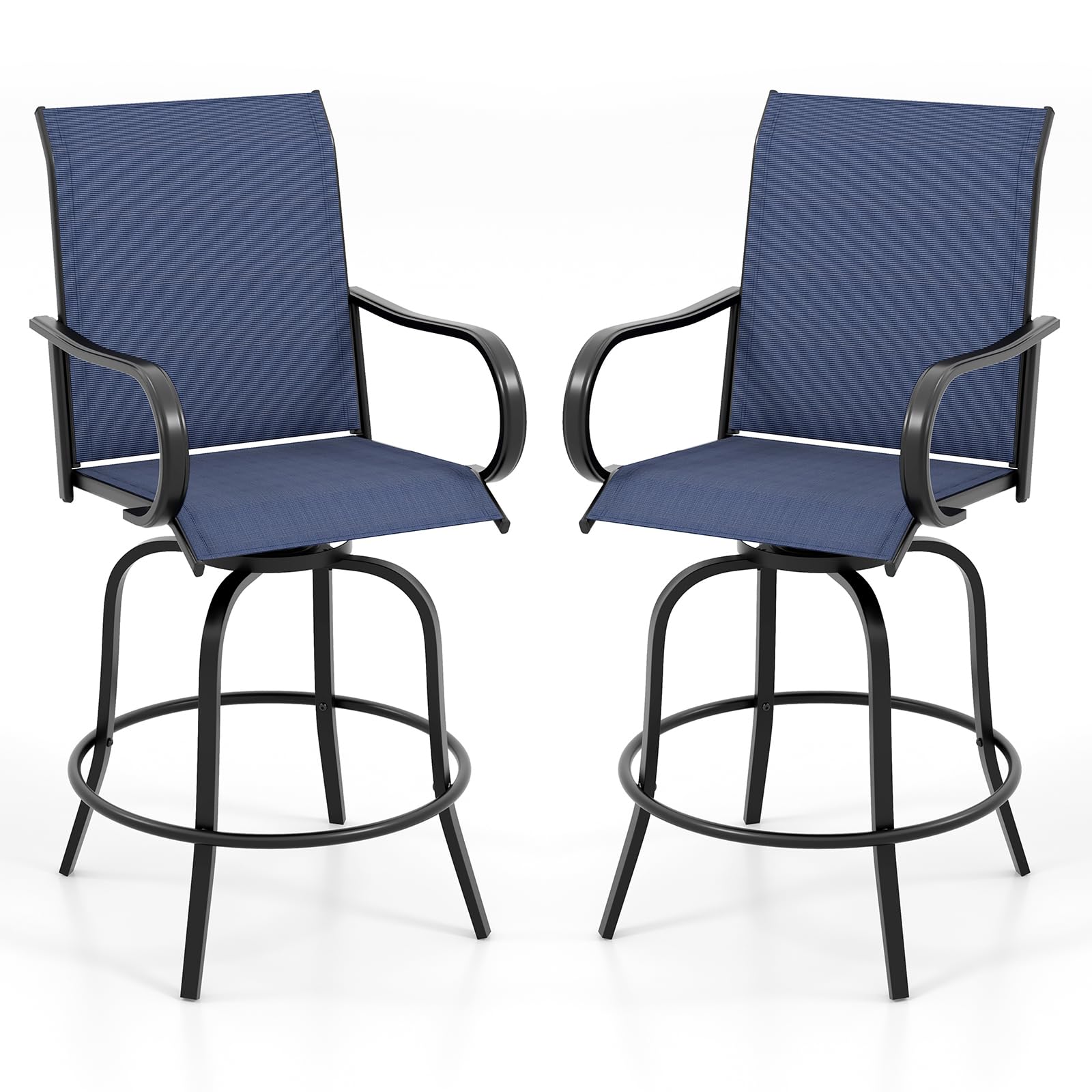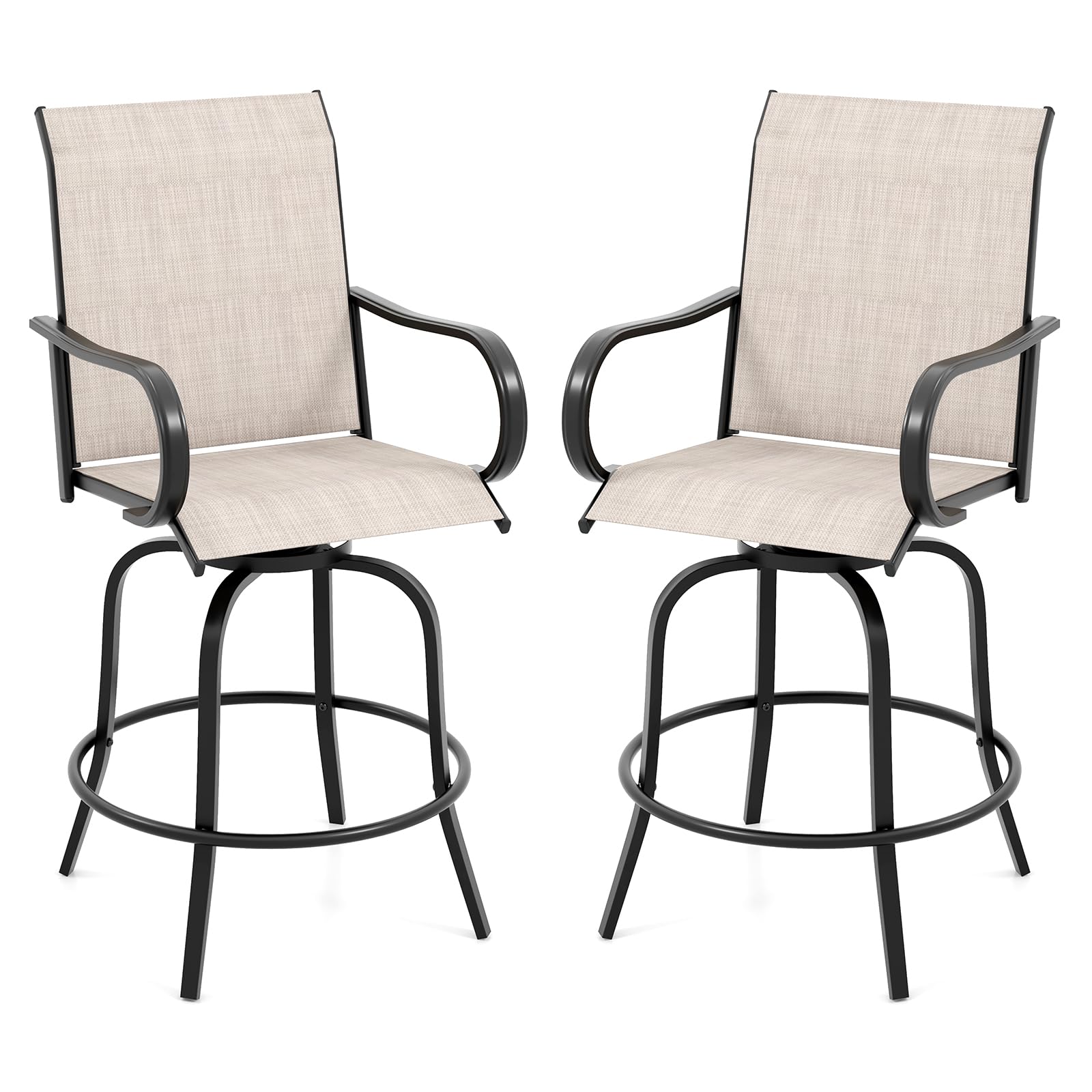 Each stool features a 360° swivel plate for smooth rotation, allowing you to effortlessly join any conversation. Constructed with heavy-duty metal pipes, these chairs offer robust support and stability for daily use. The seat fabric which is rip resistant, anti-fading and quick-drying ensures lasting comfort and durability through every season. Designed with curved backrests, ergonomic armrests, and a footrest, each bar stool provides a truly cozy sitting experience. All in all, these 2 swiveling bar chairs with well-designed details are the ideal choice for stylish and comfortable outdoor seating. Make your outdoor spaces a haven of comfort and style with these exquisite swivel bar stools.