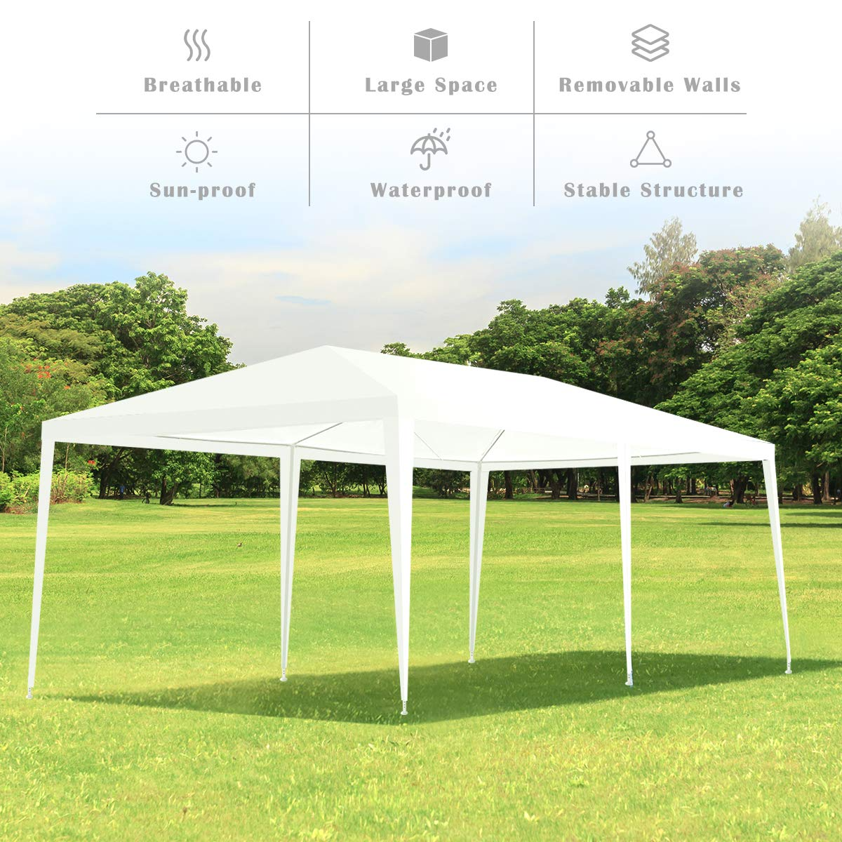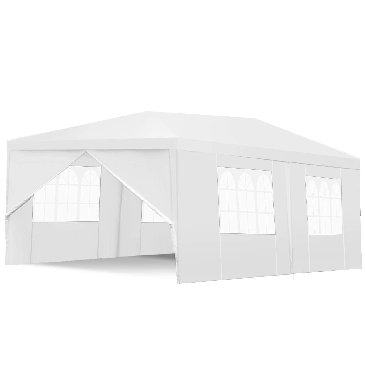 Our Tangkula 10'x20' Wedding Tent 4 Walls w/ Windows BBQ Party Outdoor Canopy Tent White is perfect for many outdoor needs. Also can be erected on hard surfaces such as decks, driveways, lawns, etc. The walls of the tent are polyethylene covered and are water resistant. The frame to put the tent together is made from steel and is powder coated to reduce rust. This item is ideal for commercial or recreational use such as parties, weddings, and flea markets. It can be put together on many surfaces decks, driveways, or even your lawn. This tent will come with all of the necessary hardware to put the item together, and it will even come with ropes and stakes for extra stability. You can use the walls that come with the item, or you can have the event without them. When every time you have a party or gathering, this tent could do for you keeping out wind and rain, and also for welcoming enjoyable sunshine. You deserve it!