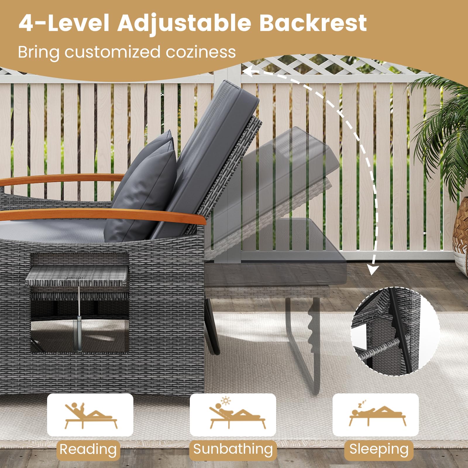 Indulge in ultimate comfort, versatility and style with this outdoor patio rattan daybed set! Whether you wanna sit, lie or have space to store items, this multifunctional outdoor furniture set always meets your needs because it features 3 ways to use it: cushioned loveseat, daybed or loveseat and coffee table set. The way to get a coffee table is simple, just open the front door of the ottoman and put the ottoman cushion in it. Apart from that, the loveseat is designed with retractable side trays to provide more storage space. It’s worth mentioning that this double chaise lounger comes with 4-level adjustable to meet your different needs. No matter which way you choose to use, the soft padded cushions make you feel comfortable all the time. In addition, the colorfast PE rattan and rustproof metal frame ensure a longer outdoor lifespan.