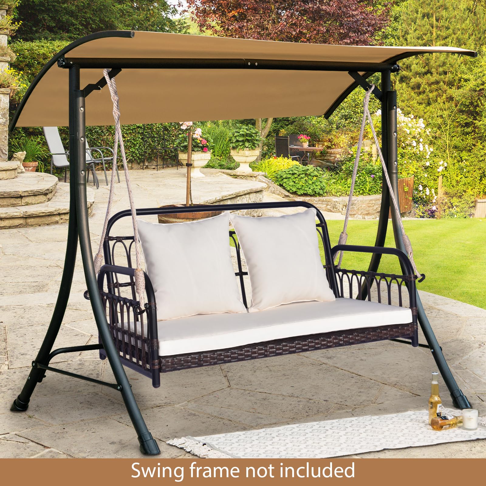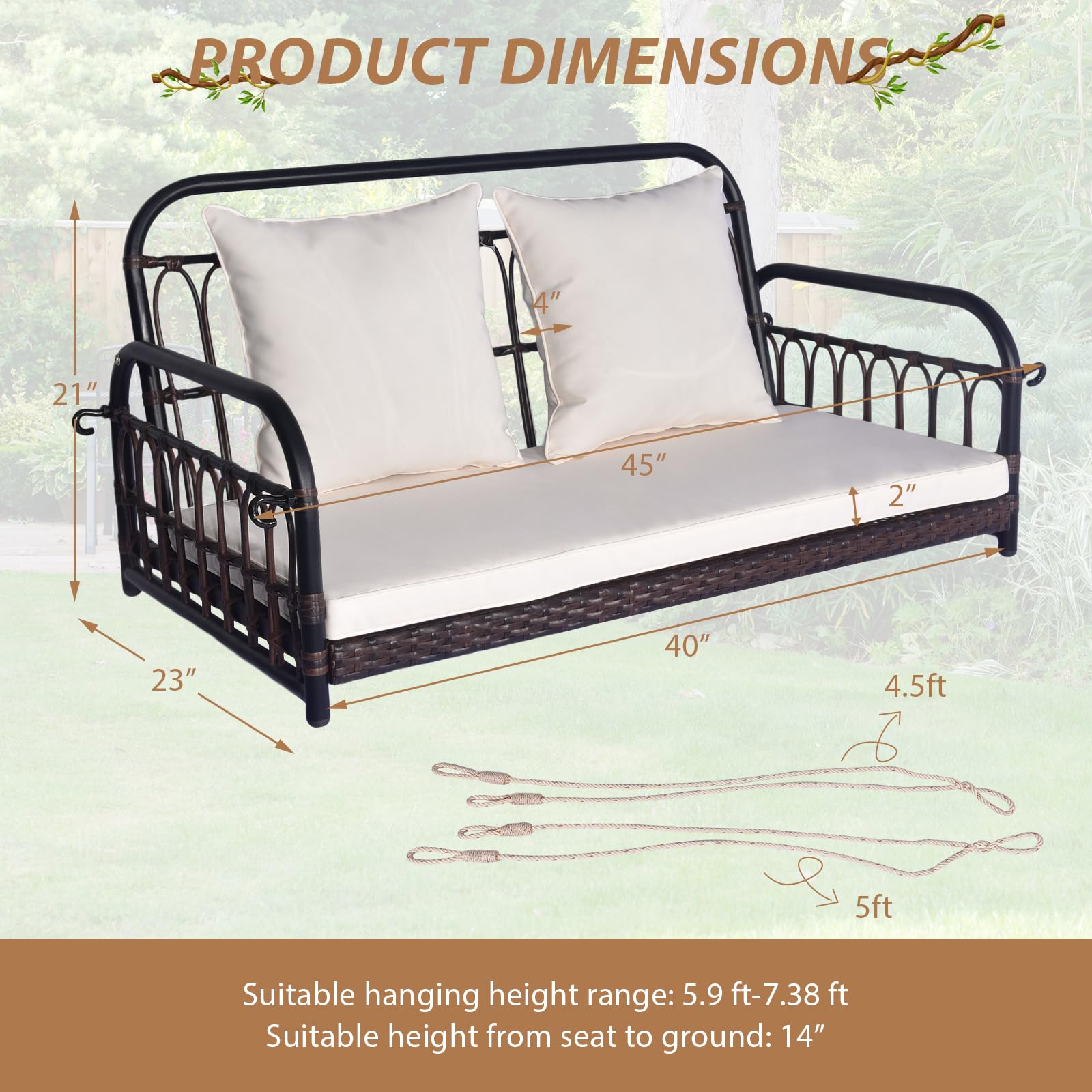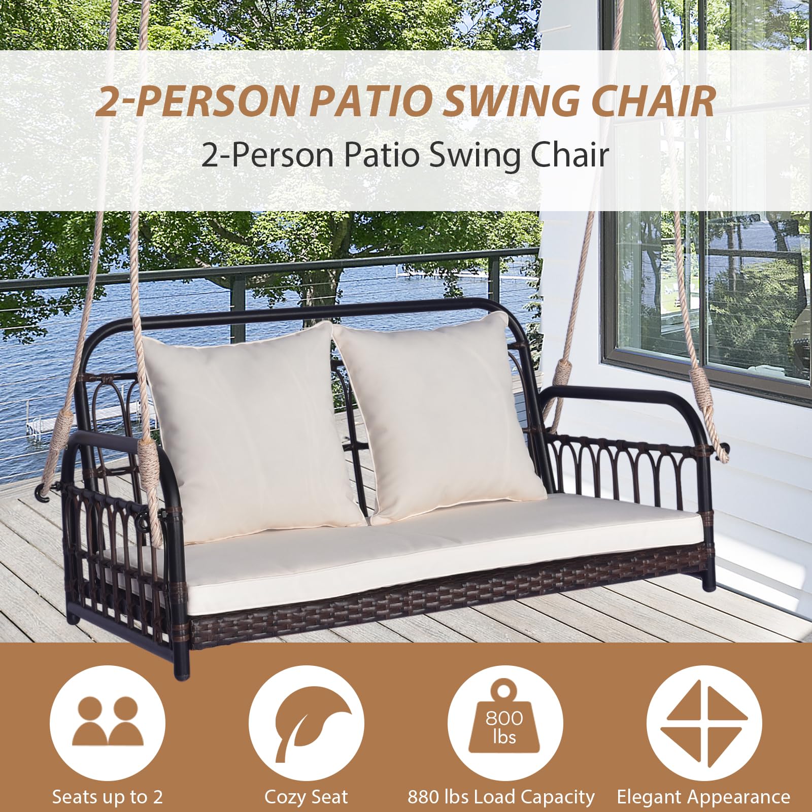 Meticulously crafted with heavy-duty metal frame, this swing loveseat is built to endure and provide you with long-lasting relaxation. And the wide seat is perfect for 2 people to relax together. Moreover, the seat and back cushions have been thoughtfully designed to maximize comfort and support, ensuring an enjoyable experience every time. With its wicker woven design, this swing chair exudes a rustic and enchanting appeal, while also boasting durability for extended outdoor use. Whether you desire a tranquil escape after a hectic day or wish to savor a moment of serenity, the patio rattan porch swing is an exceptional choice.