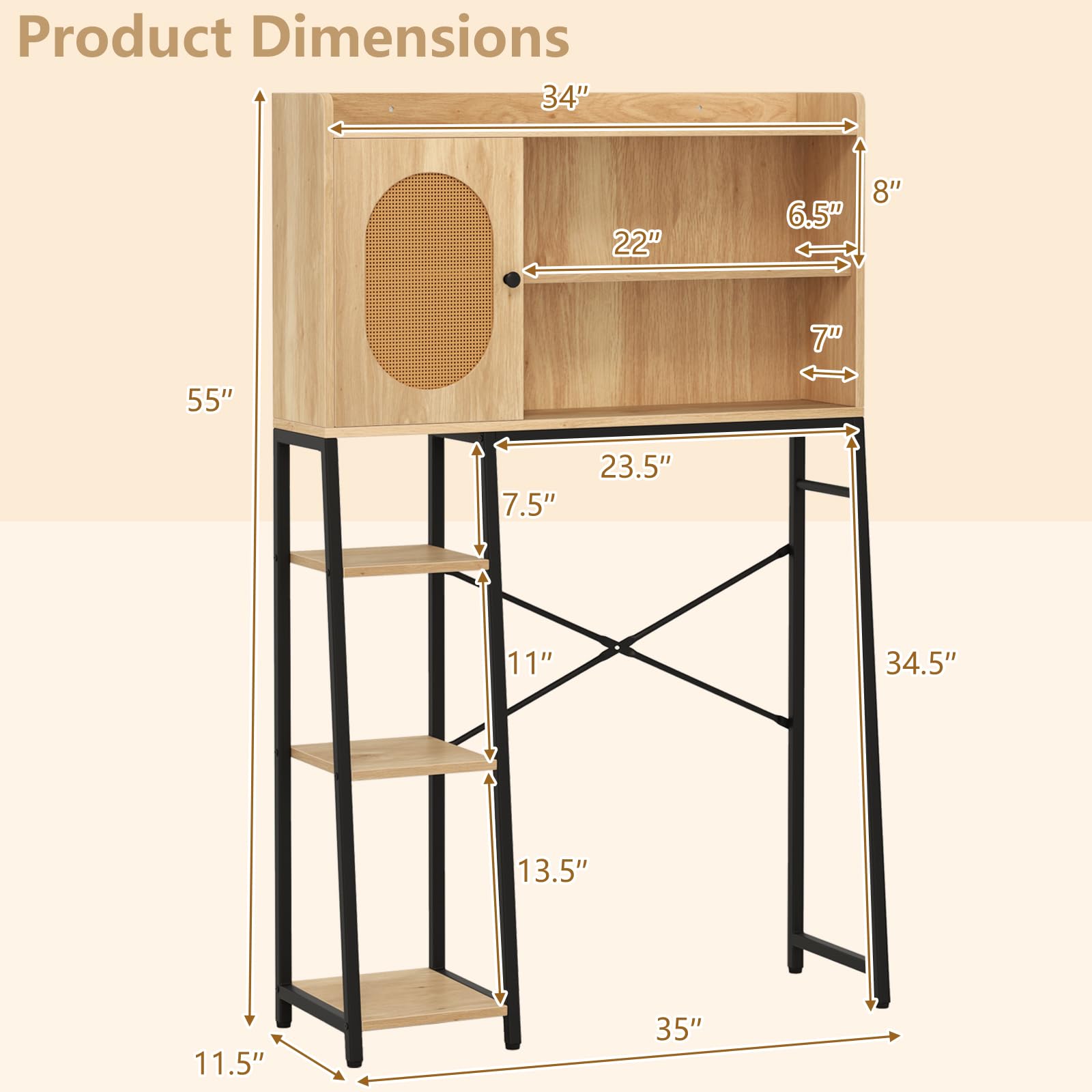 This over-the-toilet cabinet offers additional storage space without taking up too much floor space. 1 top, 1 cabinet with an active shelf, 2 compartments, and 3 open shelves will keep your bathroom items well organized. You can adjust the active shelf to hold items of different sizes. The distance between each level is 1.4". Thanks to the anti-falling baffles, the items placed on the top will be protected and won't fall off. The handy knob and soft close hinges allow for easy opening and safe closing. Moreover, the natural faux wood grain and PE rattan door make it a charming addition to your laundry and balcony. The toilet storage cabinet features a metal stand with adjustable foot pads to remain stable and steady. Additionally, the anti-toppling kits will firmly fix it to the wall.