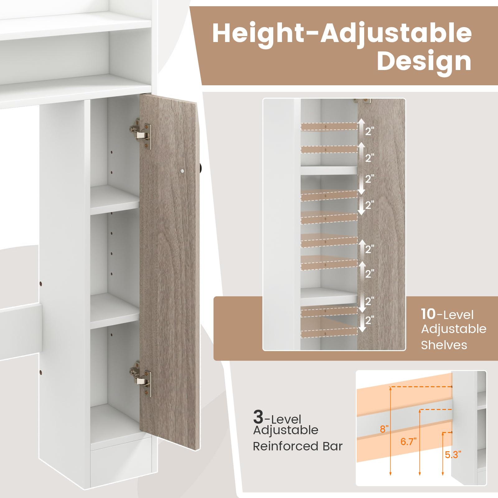 • [Adjustable Shelves & Bar]: The adjustable shelves behind the door can be freely adjusted into 10 positions to fit different-sized stuff. 2 active shelves can be easily removed to offer higher storage space. Meanwhile, there is a 3-level adjustable reinforced bar to fit different toilets.