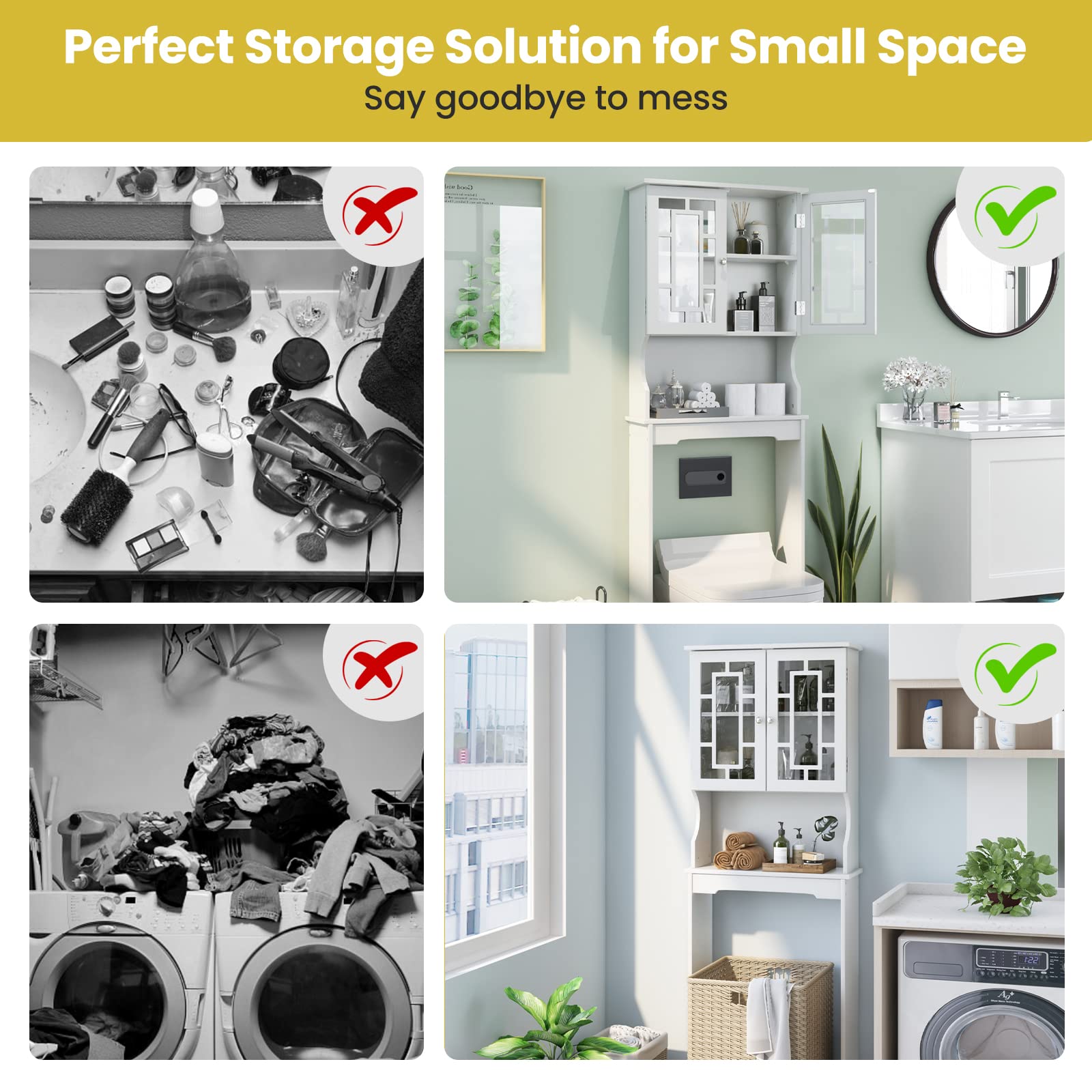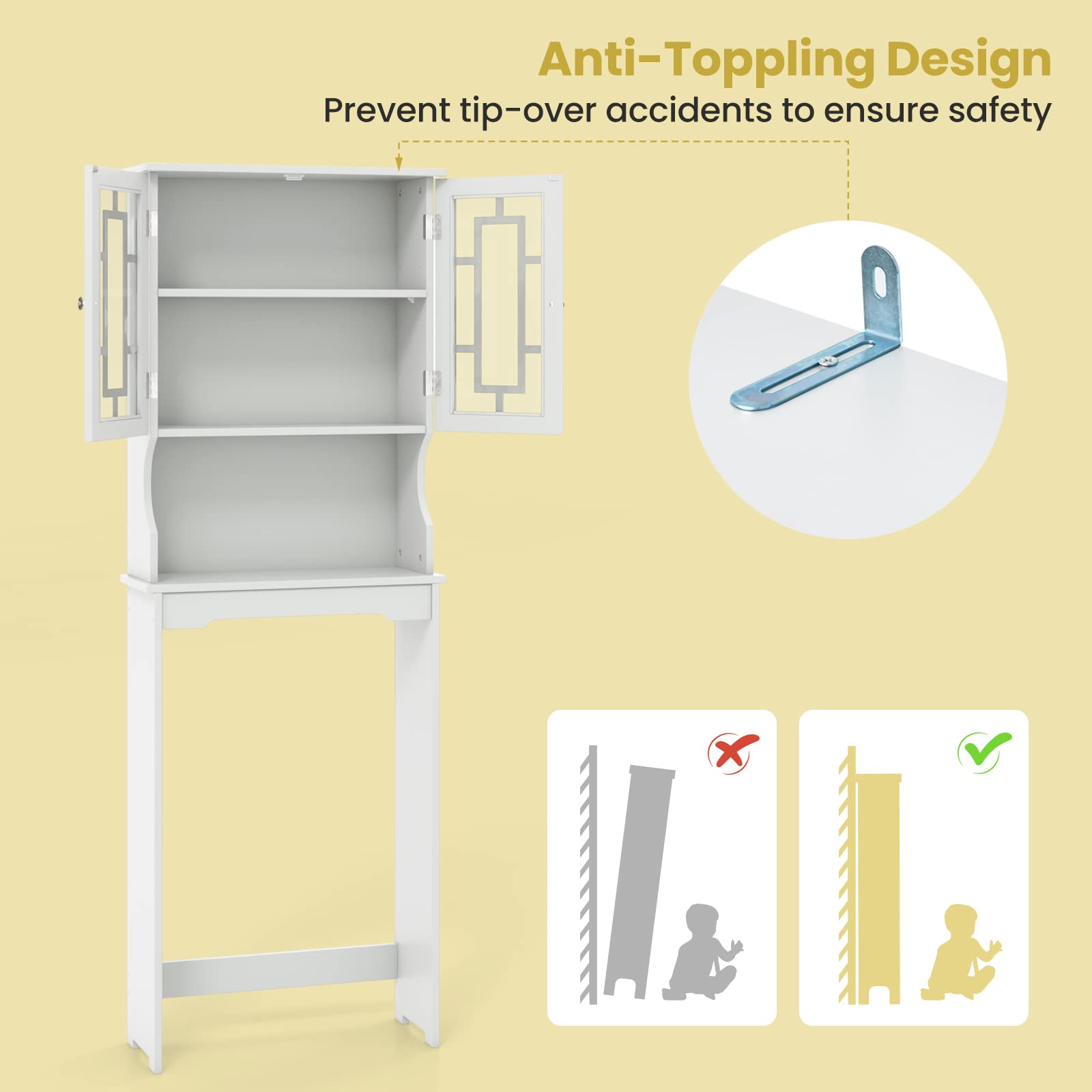 This over the toilet storage cabinet helps to keep your bathroom tidy without taking up much floor space (please measure the height of your toilet before buying). Equipped with 2 tempered glass doors, a 3-position adjustable shelf and an open compartment, the bathroom organizer cabinet offers roomy storage space and can meet various storage needs. Crafted from selected engineered wood, this bathroom space saver ensures long-lasting use. Besides, the anti-toppling device and bottom reinforced crossbar enhance stability. Meanwhile, the smooth and anti-scratch surface is easy to wipe clean.