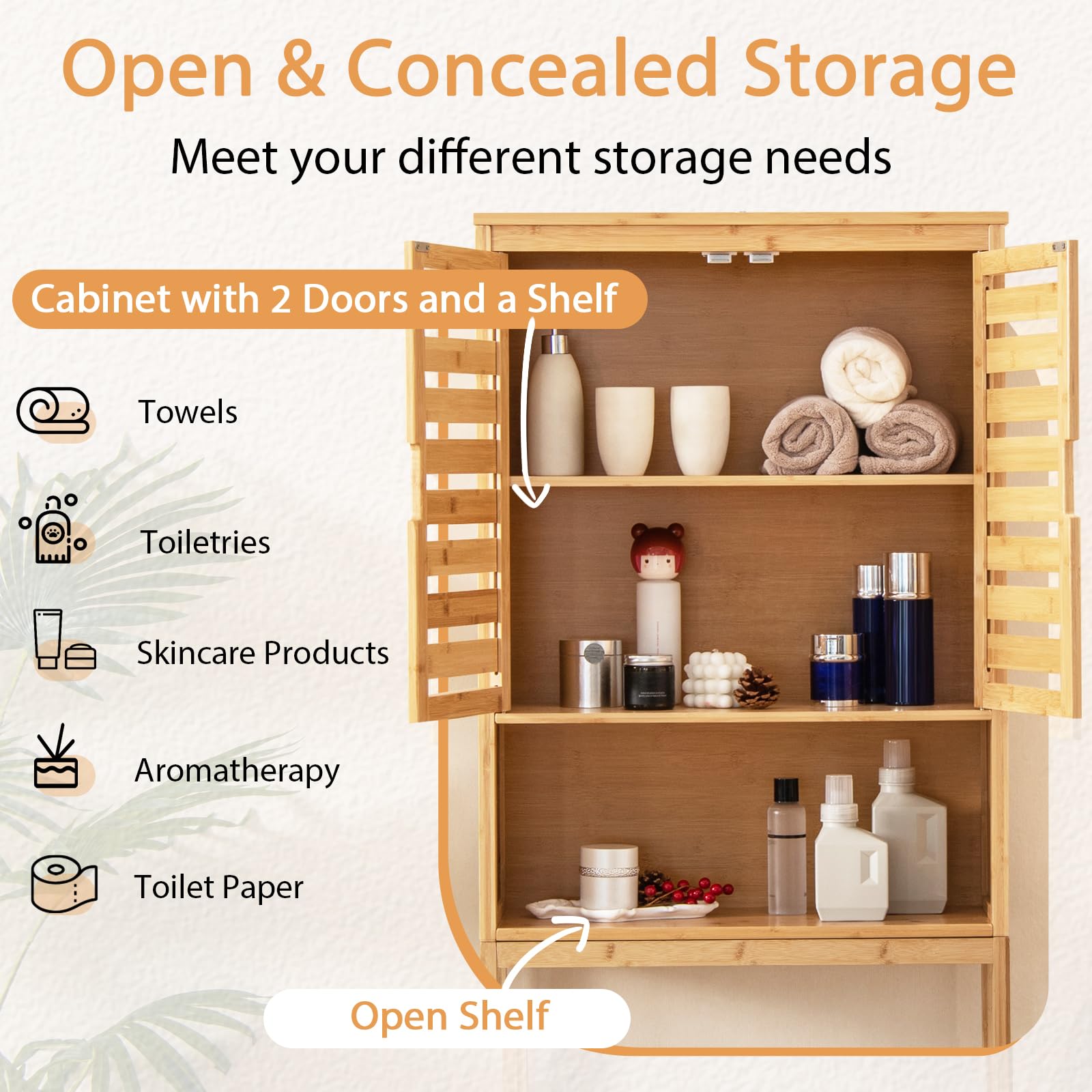 This over the toilet organizer combines open and concealed storage together, which is designed with a cupboard and an open shelf. The spacious ground clearance fits to most toilets. Plus, the bottom bar is adjustable in 3 heights according to the height of your valve. Made of selected bamboo and MDF material, this bathroom storage cabinet is durable for long-time use. For added security, you can fix it to the wall using an include anti-toppling device.