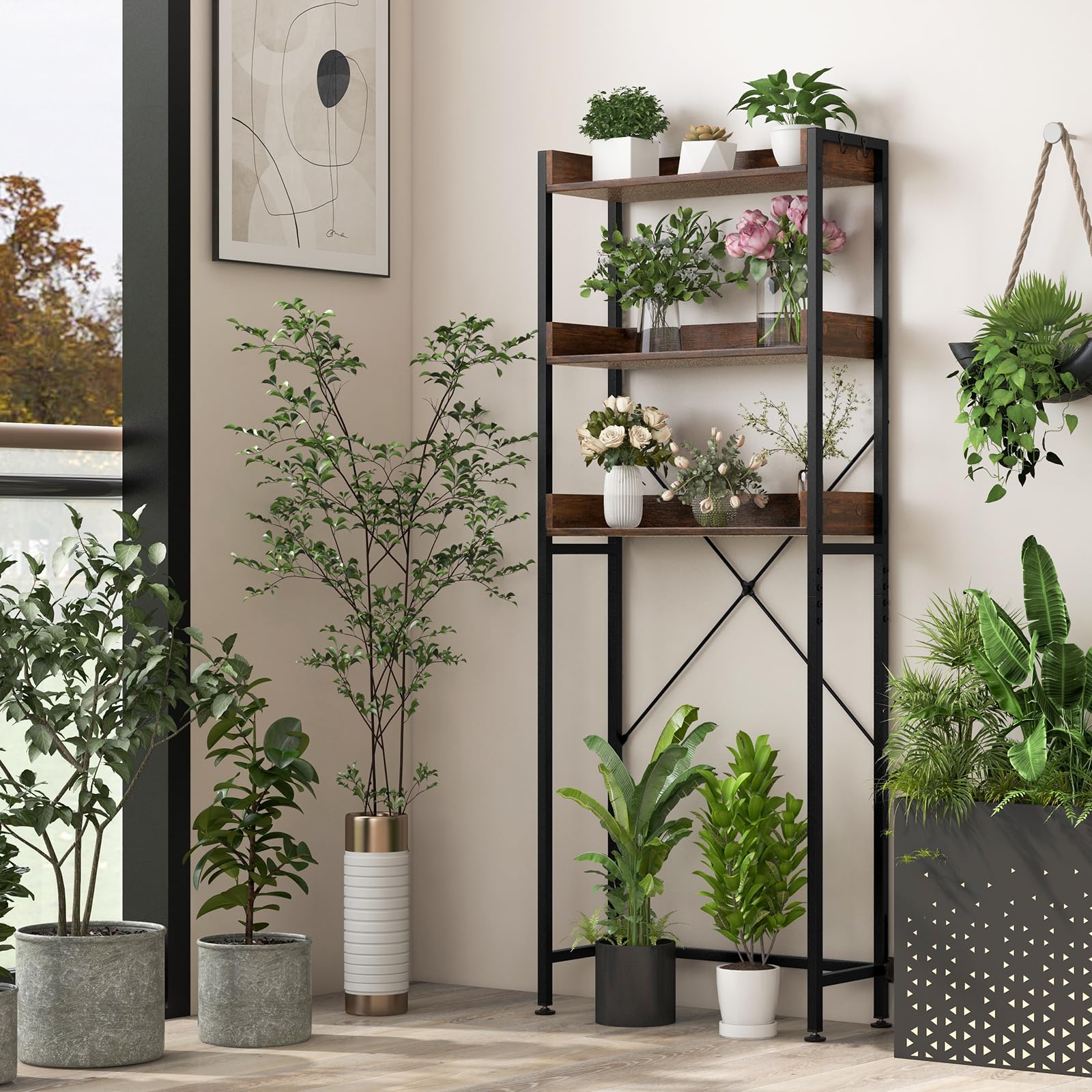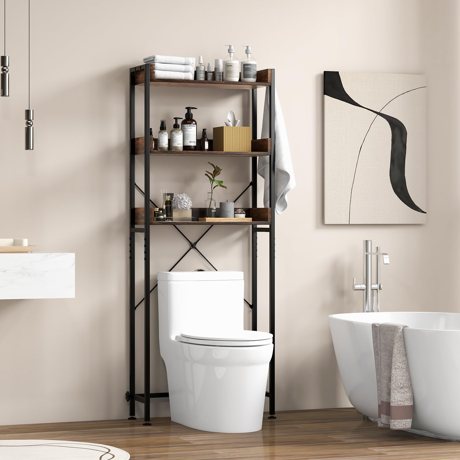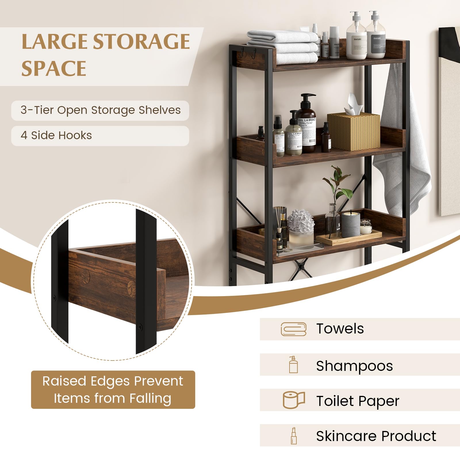 - [Large Storage Space]: This over the toilet rack features 3-tier open storage shelves and 4 side hooks to keep your bathroom essentials organized and easily accessible, such as towels, shampoos, toilet paper, skincare products, etc. Plus, the raised edges prevent items from falling.