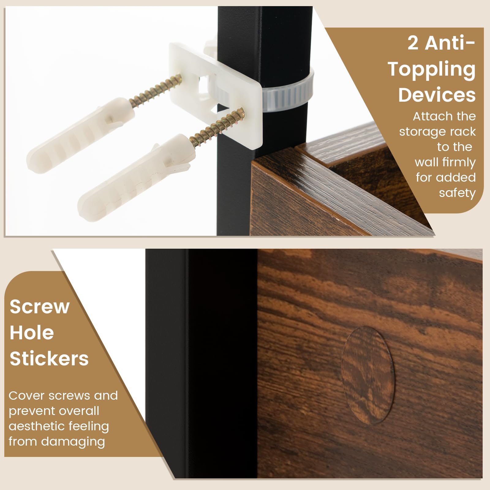 - [Secure & Humanized Design]: 2 anti-toppling devices are included to attach the storage rack to the wall firmly for added safety. In addition, the toilet shelf comes with screw hole stickers, which can cover screws and prevent overall aesthetic feeling from damaging.