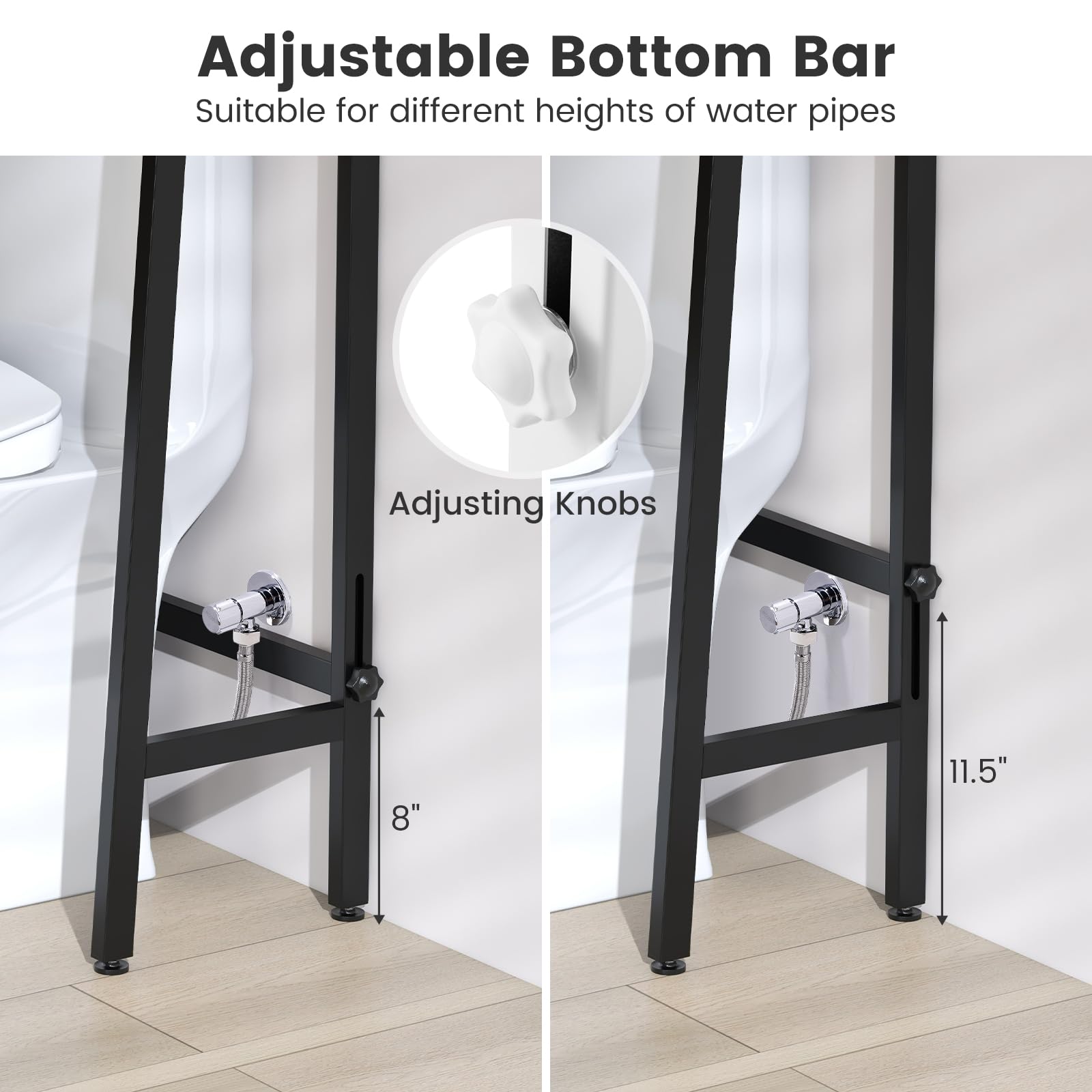 - Suit Various Toilet Sizes: There is a spacious bottom space under the over-the-toilet shelf, which allows for different sizes of toilets as well as laundry baskets. Besides, since toilet water pipes may vary in height, you can adjust the bottom bar to the suitable height (from 8” to 11.5” / 20.5 to 29.5 cm) by the adjusting knobs.