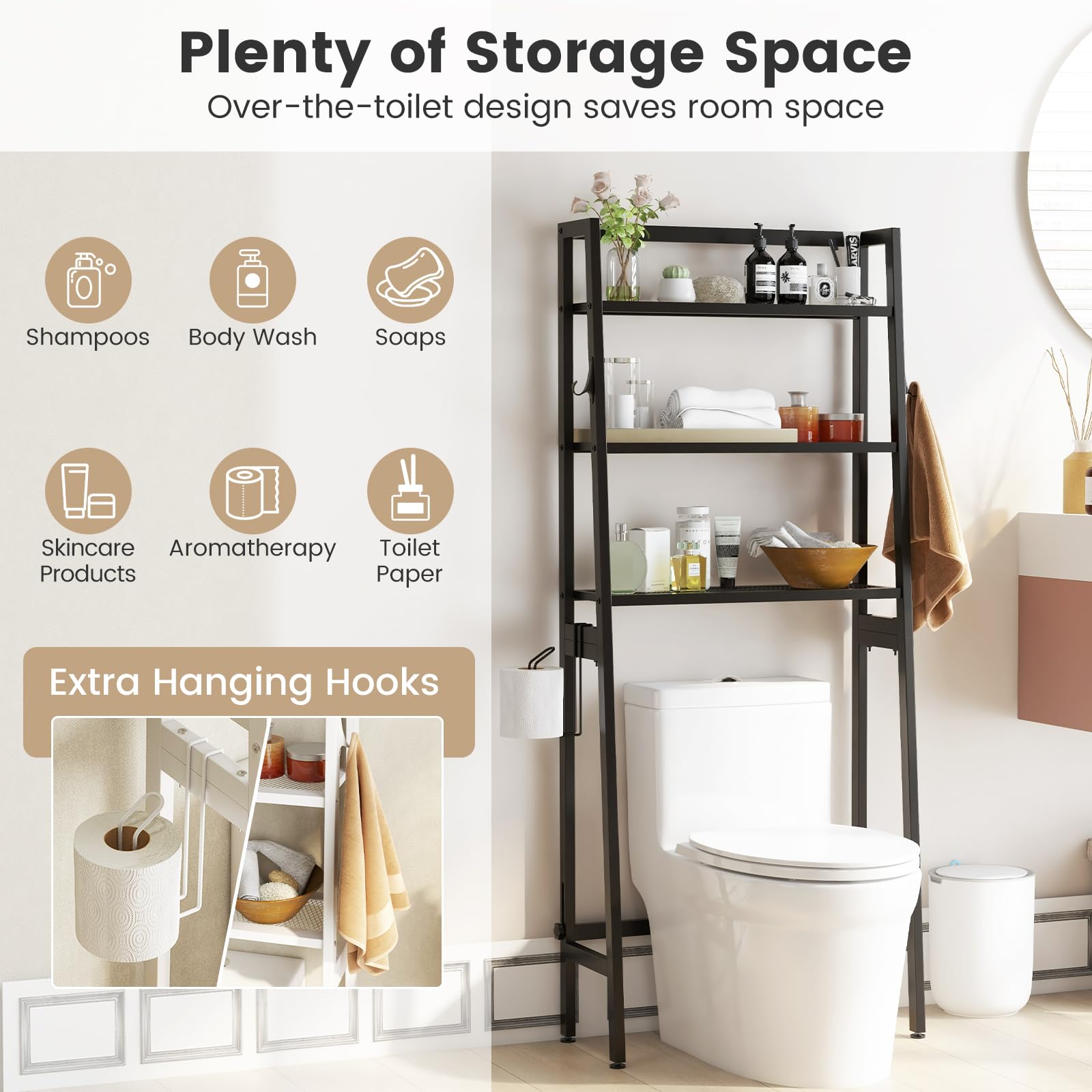- Plenty of Storage Space: Equipped with 3 open shelves and 2 side hanging hooks, this free-standing over the toilet storage rack can store many bath items, such as shampoos, body wash, soaps, skincare products, aromatherapy, towels, etc., which can keep your bathroom tidy. Plus, a toilet paper holder is provided for easy access.