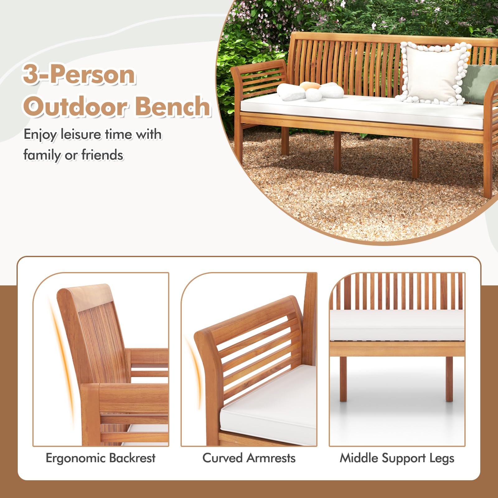 Crafted from premium acacia wood known for its durability, this bench stands out with its naturally burr-free elegance and robust stability. And it accommodates 3 people comfortably, allowing for memorable moments in the open air. The removable cushion with high-density sponge offers additional comfort, while its easy-to-clean zippered cover and secure ties enhance convenience. Ergonomically tailored with a backrest and curved armrests, along with support legs for a formidable 1200 lbs capacity, this bench promises relaxation without compromise. Add a touch of sophistication and leisure to your outdoor spaces with this fabulous relaxing choice.