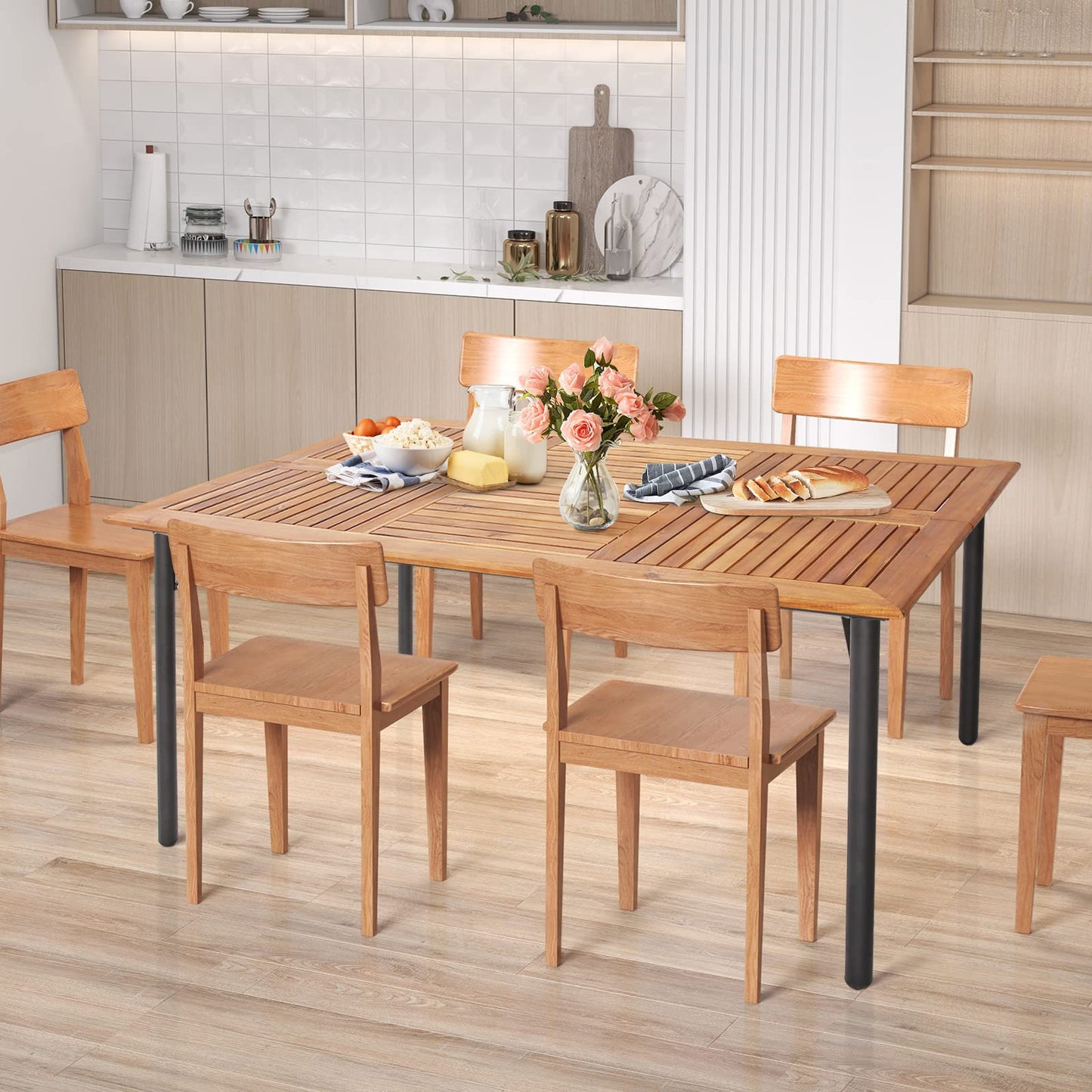 Our 63"x 36"spacious outdoor dining table provides a large for placing vases, tableware, food, and other decorations, bringing convenience to your outdoor leisure time. And with its natural wood grains and sleek lines, this farmhouse dining table can also be a highlight to any indoor or outdoor area. Moreover, the tabletop is crafted with solid acacia wood and the frame is constructed of high-strength and rustproof powder-coated metal, ensuring long-term outdoor use. Other than that, the dining table is designed with a built-in umbrella hole (diameter: 1.9", bringing convenience for inserting an outdoor umbrella and enjoying a shady outdoor area. Whether holding parties, having BBQ, or chatting with your friends or family, our outdoor and indoor dining table can be a perfect choice!