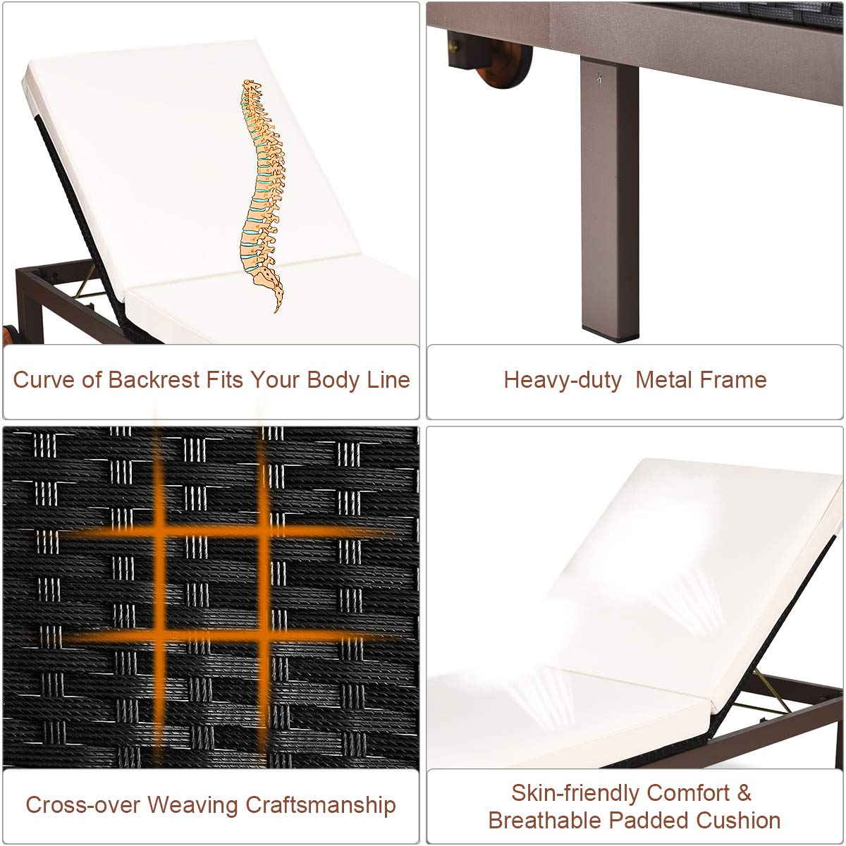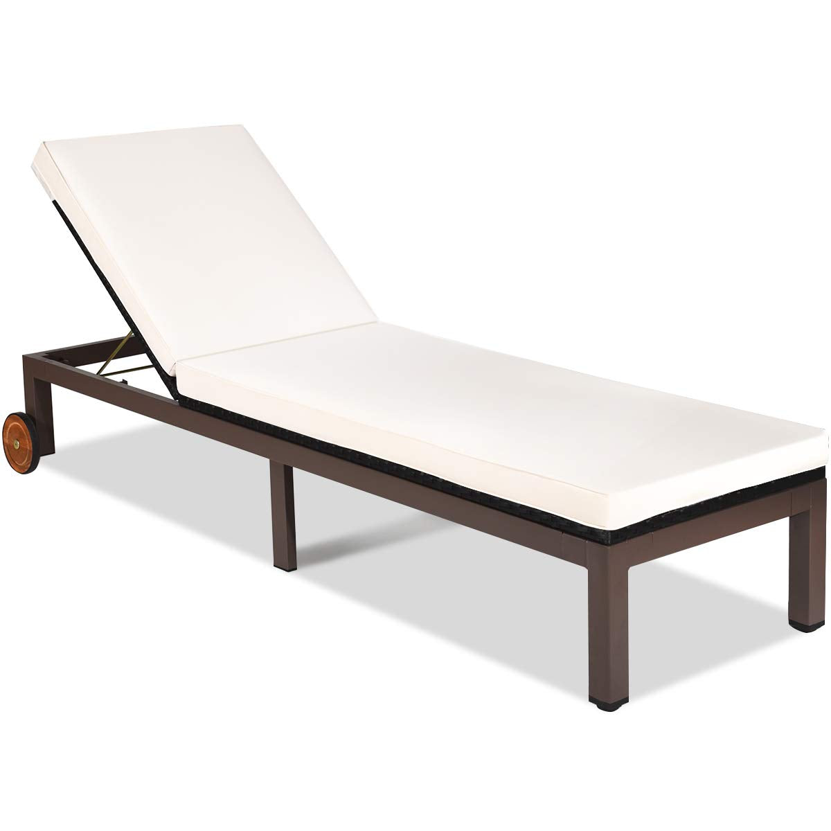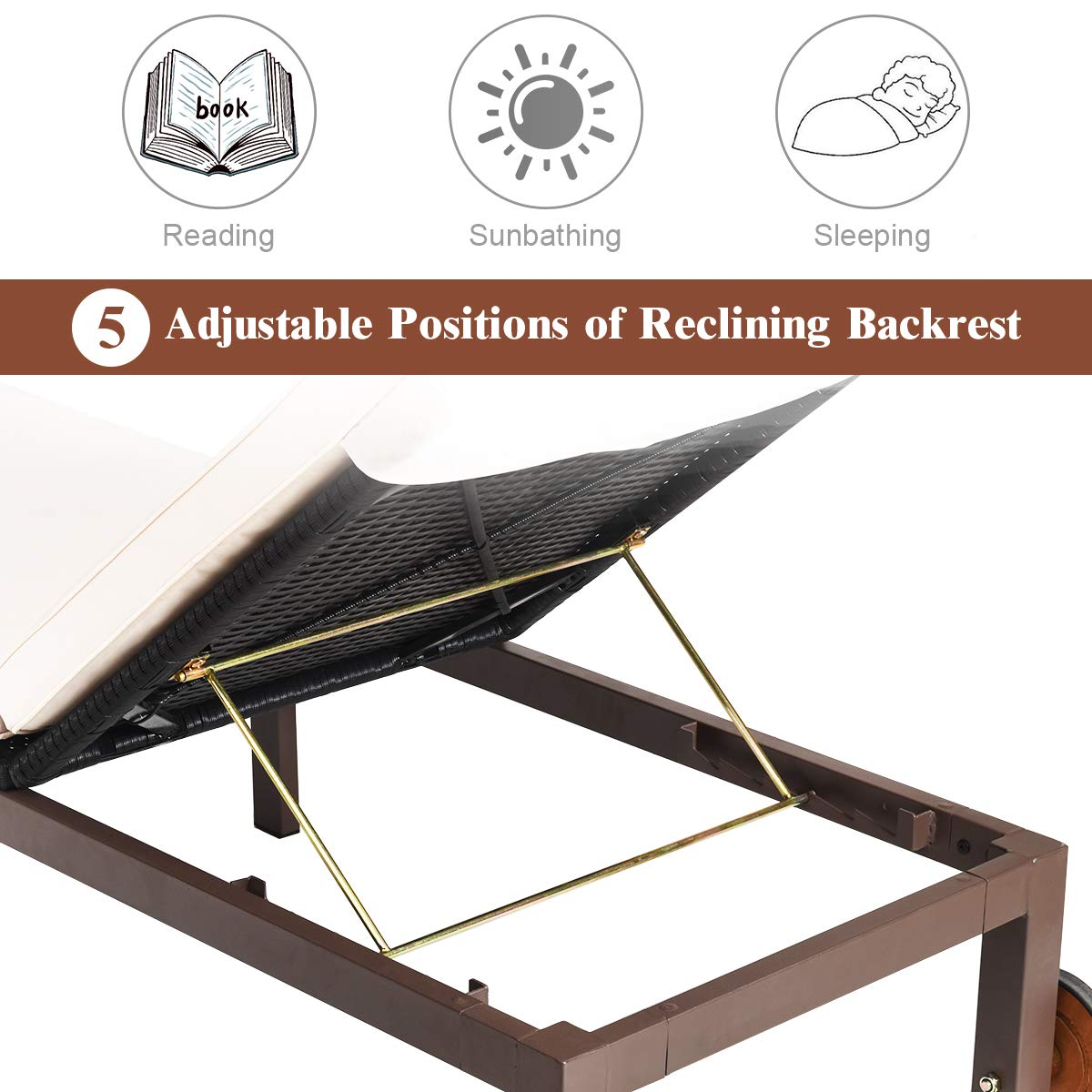 Our outdoor rattan lounges are the perfect choice for your sunbathing and outdoor enjoyment. Our rattan lounge chair is made of high-quality PE rattan and has a metal frame, that holds up to 375 lbs. And the adjustable backrest in 5 tilting positions satisfies your different needs for reading, lying, and sleeping. The cushions that cover the entire chair provide a comfortable seating experience. This lounge chair is ideal for balconies, beaches, and pools so you can enjoy fresh air anywhere. When you're done with rest, you can easily move it elsewhere with the bottom wheels.