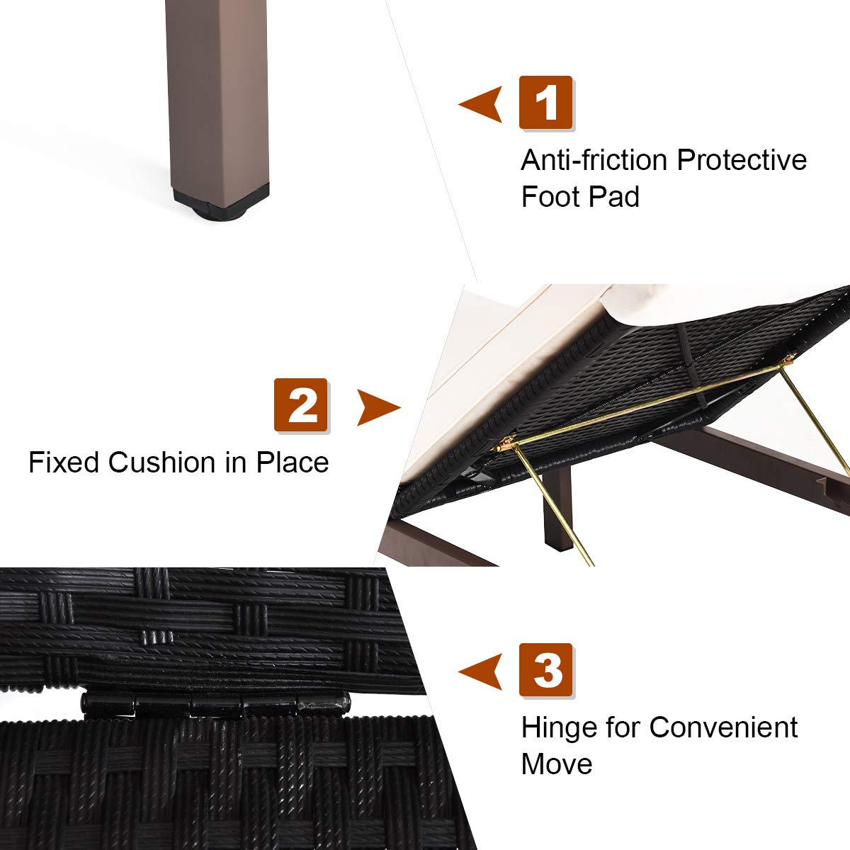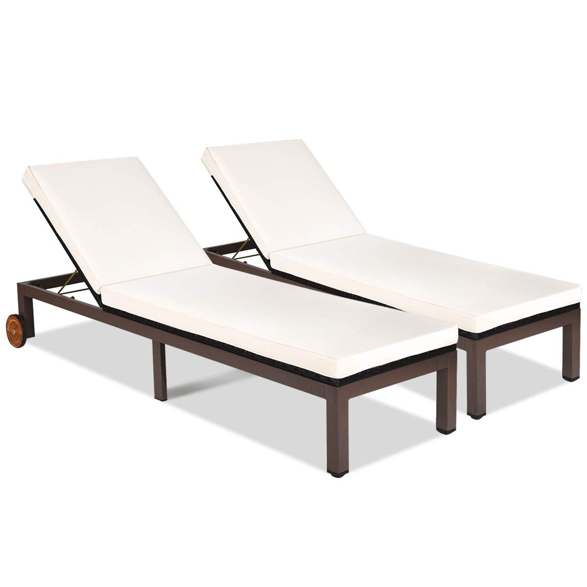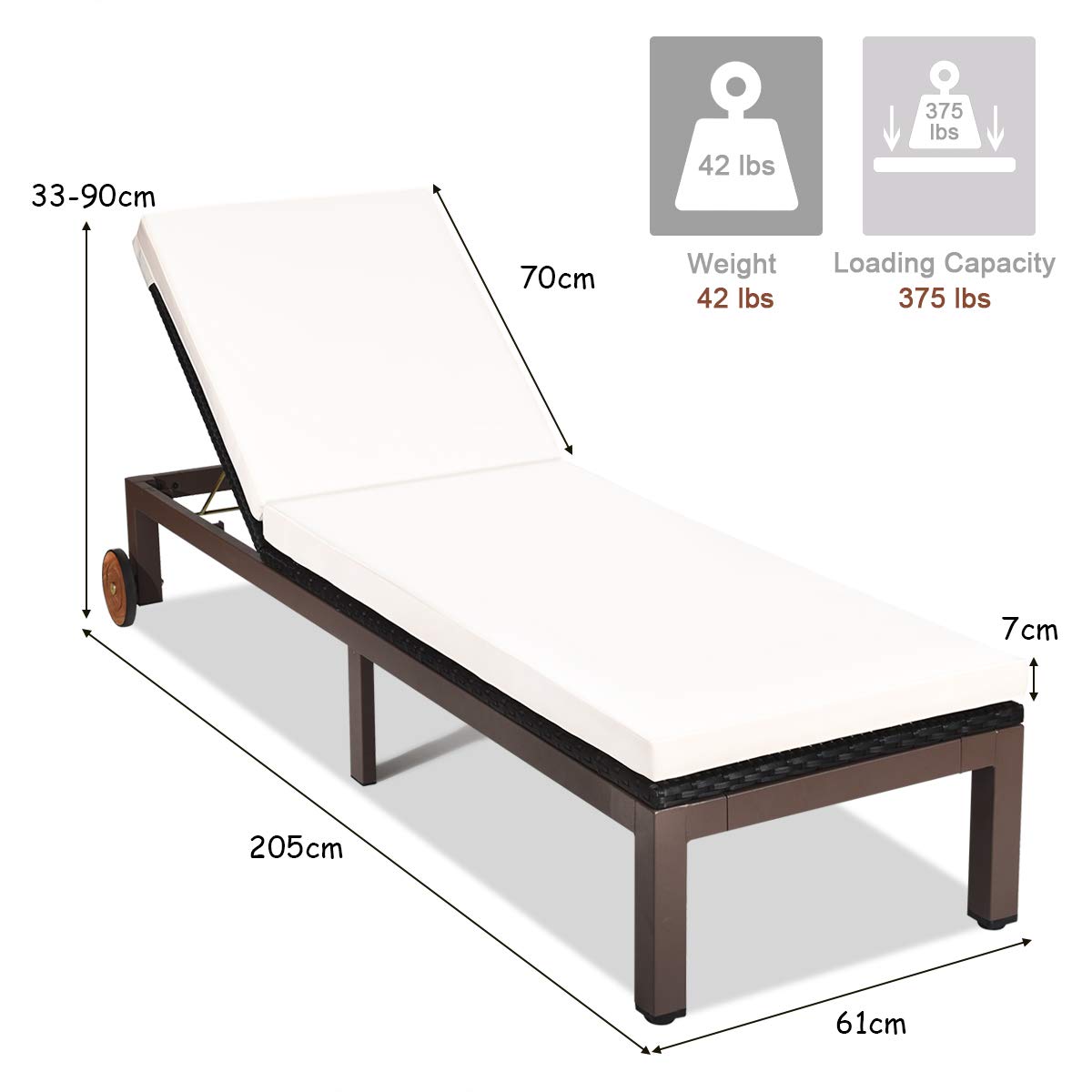 Our outdoor rattan lounges are the perfect choice for your sunbathing and outdoor enjoyment. Our rattan lounge chair is made of high-quality PE rattan and has a metal frame, that holds up to 375 lbs. And the adjustable backrest in 5 tilting positions satisfies your different needs for reading, lying, and sleeping. The cushions that cover the entire chair provide a comfortable seating experience. This lounge chair is ideal for balconies, beaches, and pools so you can enjoy fresh air anywhere. When you're done with rest, you can easily move it elsewhere with the bottom wheels.