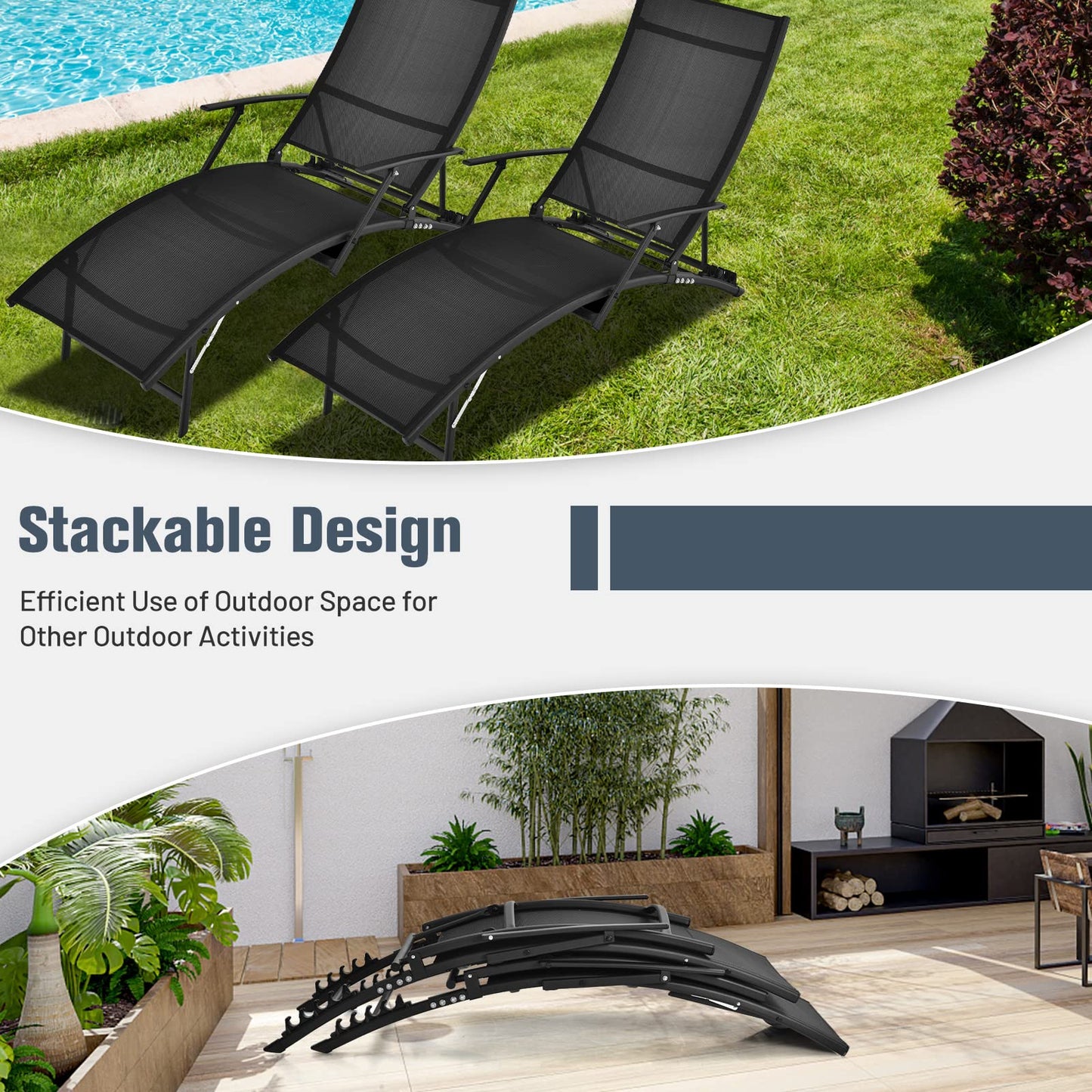 Just enjoy your spare time with our patio chaise lounge chairs! The strong anti-rust steel frame with anti-slip foot pads ensures your safety when lying on the patio chaise lounge set. And, the breathable and fast-drying fabric is chosen for the outdoor environment. With the 5-position backrest adjustment, you can get the proper angle for reading, sunbathing, or resting. Moreover, the streamlined curved design makes these outdoor recliners fit your body curve perfectly. Thanks to the foldable design, easy movement is possible. And the stackable design saves your space. The simple yet elegant outlook fits most outdoors, like patios, backyards, gardens, etc.