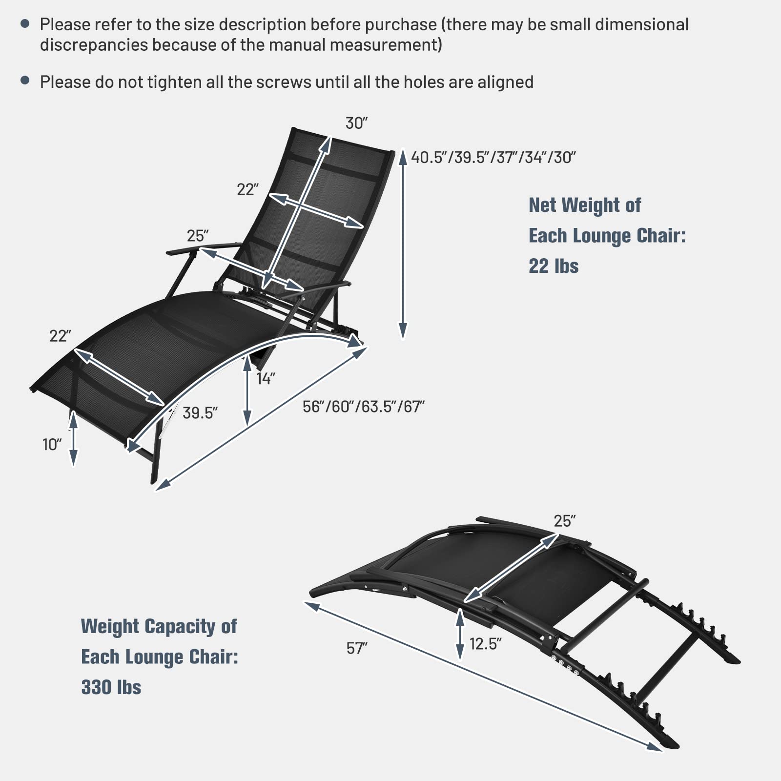 - Quick Installation: Please do not tighten all the screws until all the holes are aligned. Unfolding dimensions of each lounge chair: 56"/60"/63.5"/67"x 25"x 40.5"/39.5"/37"/34"/30"(L x W x H), folding dimension of each lounge chair: 57"x 25"x 12.5"(L x W x H), weight capacity of each lounge chair: 330 lbs. Please refer to the size description before purchase (there may be small dimensional discrepancies because of the manual measurement).