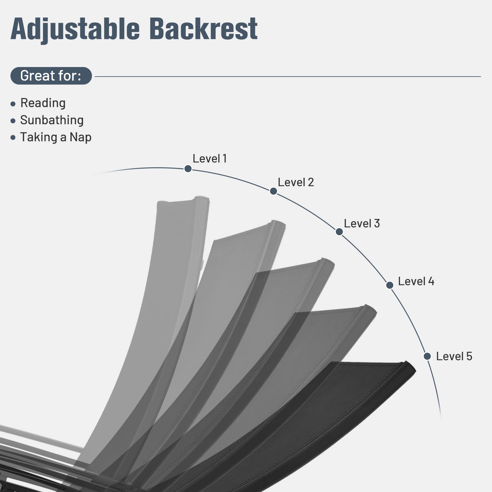 - Adjustable Backrest: By adjusting the backrest of this patio lounge recliner set to 5 different heights, whether sitting or lying down is accessible to make it great for reading, sunbathing, and taking a nap. And, the chaise longue chairs feature a streamlined curved design to perfectly fit the curves of the human body. Ergonomic armrests provide a resting place for your arms.