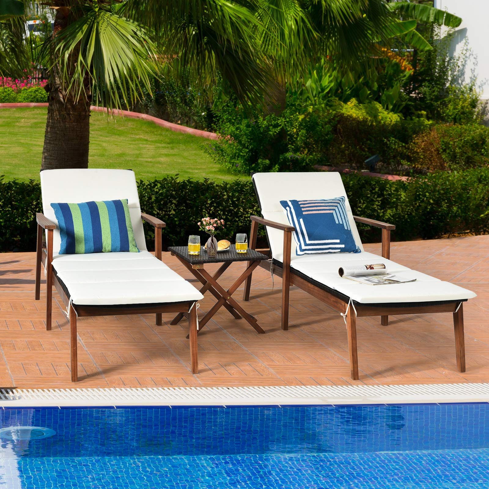 Relax in your backyard with the high-quality chaise lounge chairs. These fashionable and functional lounges will fit perfectly near any swimming pool or garden area. Constructed of a durable wood frame and wrapped around with premium rattan, these outdoor chaise lounges are durable enough to withstand wind and exposure to the sun for year-round use. You can adjust the backrest of the twin chaise lounge to suit your comfort needs or let it lay flat like a bed that's perfect for an afternoon nap. Full padded cushions offer you a comfortable experience. You can remove the cushion from the lounge chaise on hot summer days or add cushions to this pool furniture for winter use. It is perfect for a pool, balcony, garden, sandy beach, outdoor recreation place, and other suitable places. Give people a good sense of relaxation and enjoyment!