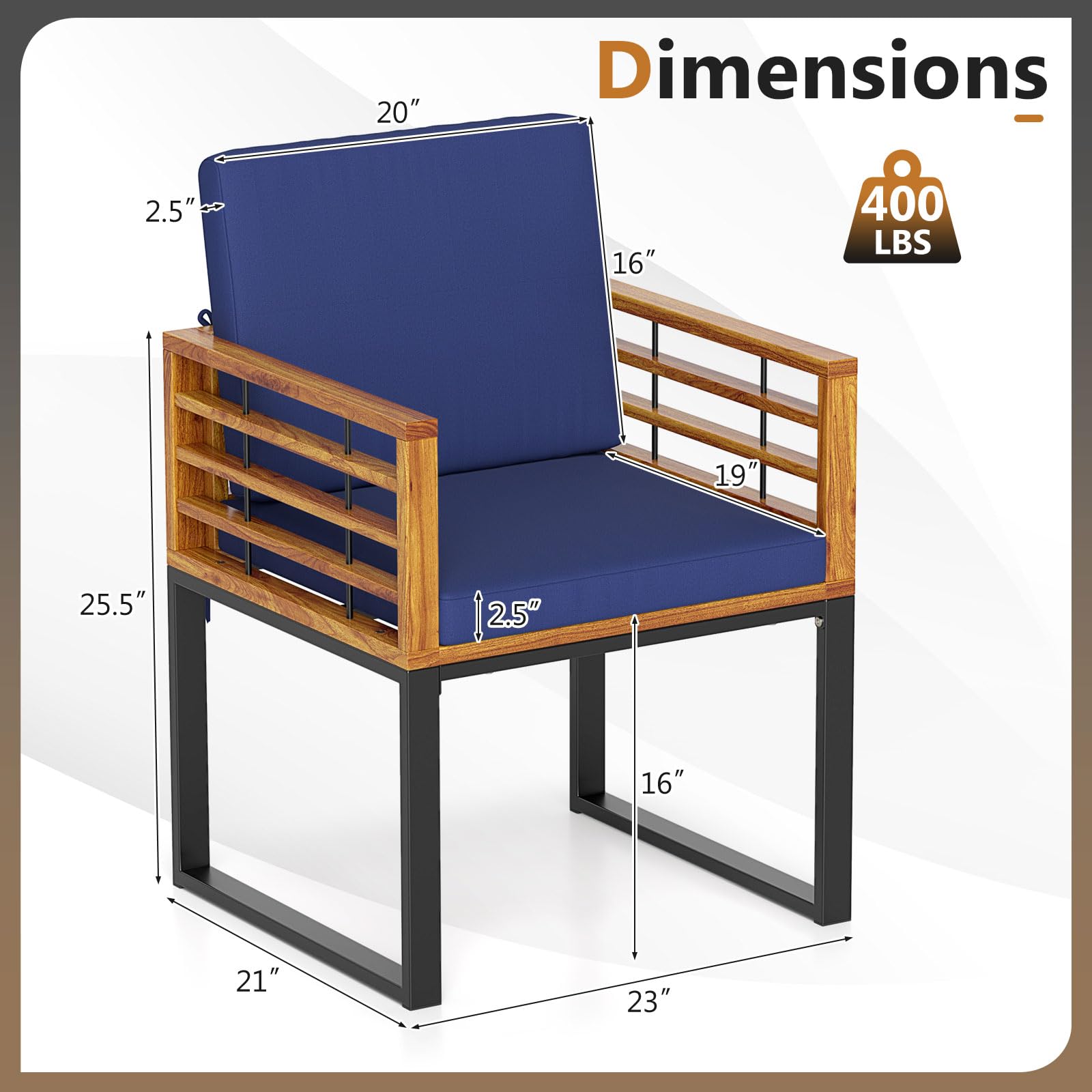Crafted from high-quality acacia wood, these armchairs feature long-lasting service life and naturally elevate your space. Each chair boasts a sturdy metal frame supporting up to 400 lbs, ensuring stability and longevity. The comfortable seat and back cushions, complete with smooth zippers and secure ties, make these chairs a fabulous choice for enjoying long, leisurely days outdoors. Ideal for backyards, poolsides, or balconies, these dining chairs promise both function and elegance, enhancing your outdoor living experience.
