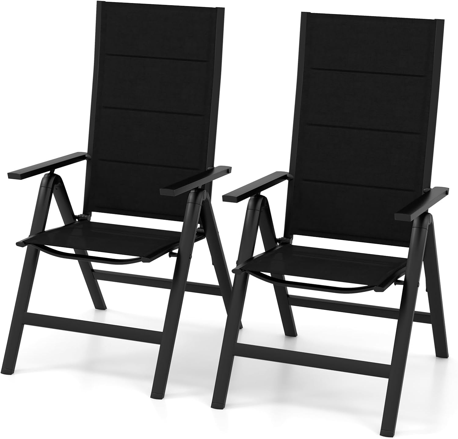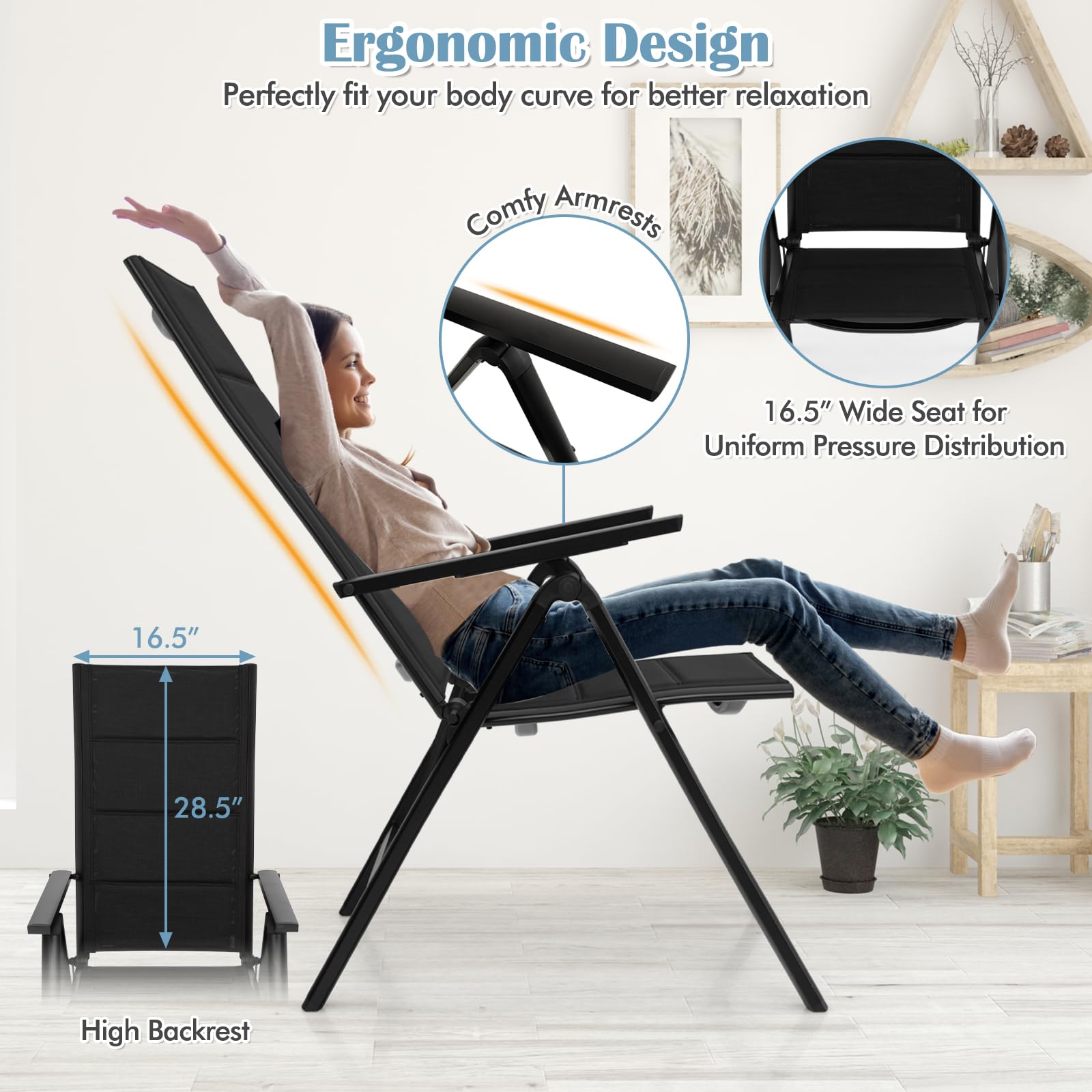 Our patio folding chair set is suitable for a wide range of outdoor activities. Whether you're enjoying a meal with friends and family, lounging in the sun, appreciating the beauty of nature, going camping, or simply enjoying a day at the beach, these chairs can be a perfect choice. And it adopts a 7-position adjustable backrest, allowing you to find the most comfy lying angle for lounging. Besides, the breathable and comfortable padded seat and backrest are filled with quick-drying sponge and covered by mesh fabric, providing ultimate comfort even during extended periods of use. More than that, with its high backrest, armrests, and wide seat, this ergonomic dining chair could perfectly fit your body curve for better relaxation. Besides, the chairs are supported by high-strength aluminum tubes, which provide exceptional strength and stability, ensuring long-term outdoor use. Enjoy the freedom to relax in style, wherever your adventures take you.
