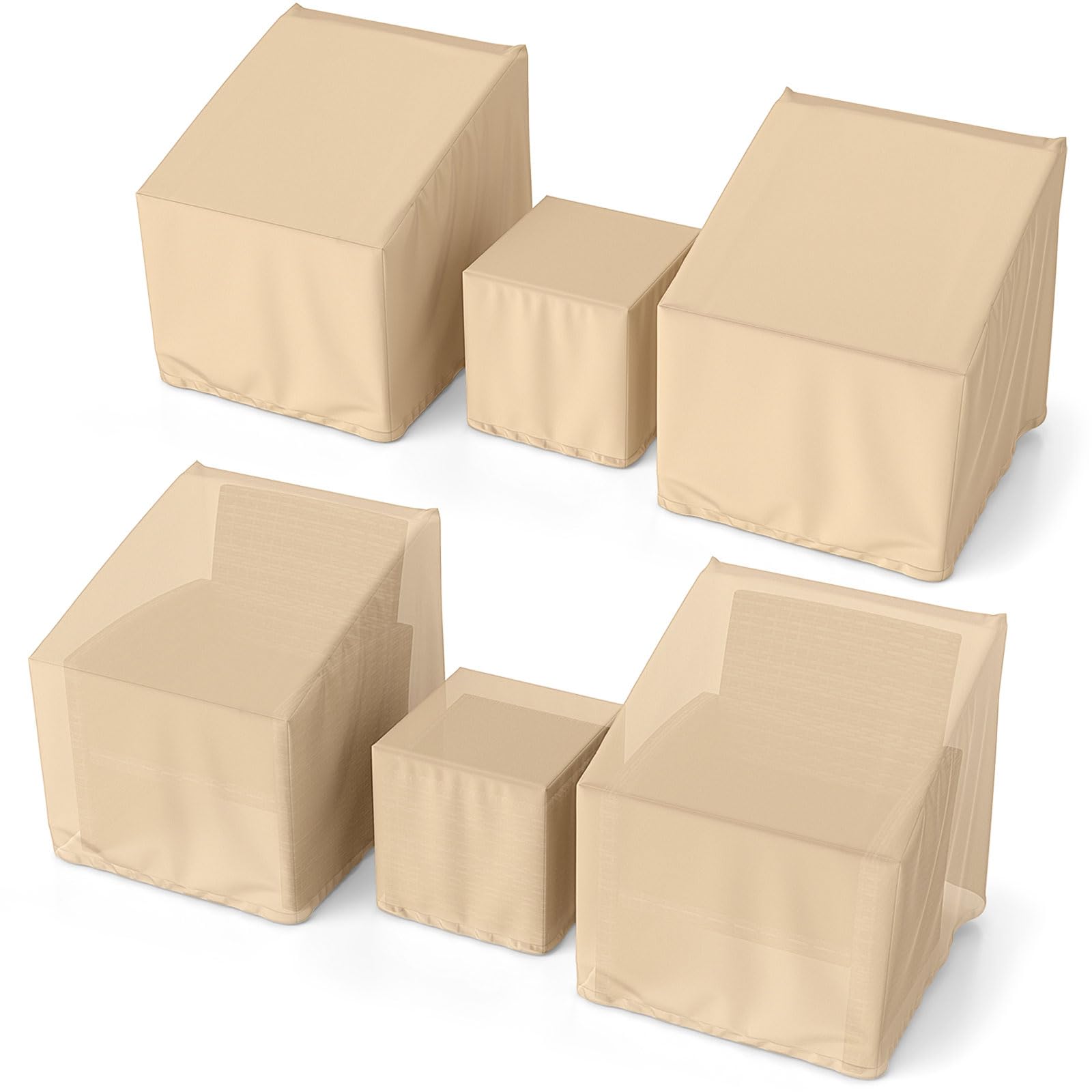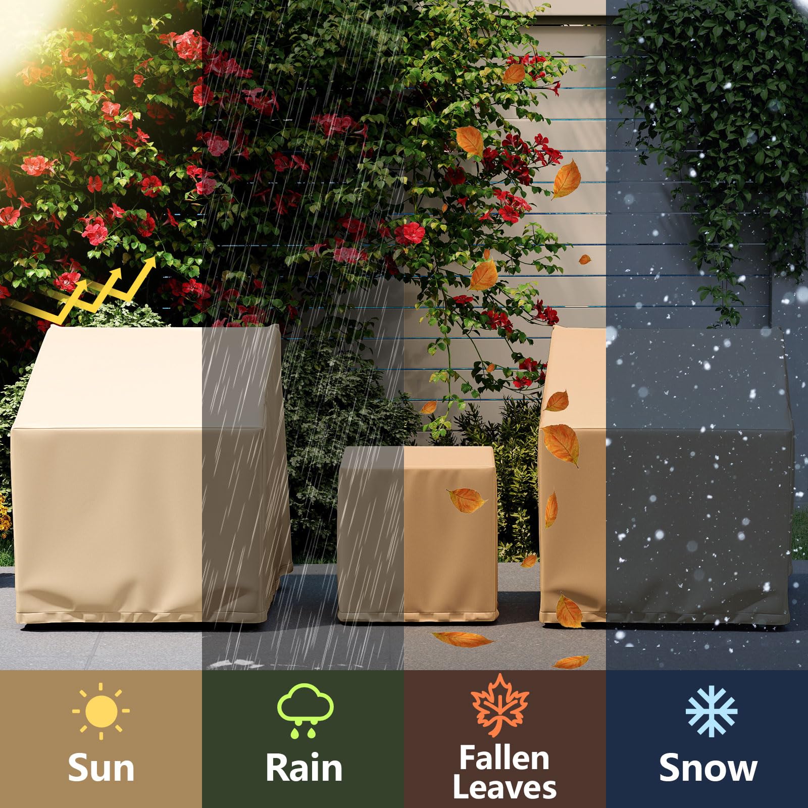 This 3-piece cover set is tailored to shield 2 chairs and a coffee table from the elements, ensuring that your setup remains pristine and ready for use all year round. Made of premium polyester fabric with PU coating, the patio chair and table covers are resistant to sun, tear and wear. Engineered for better wind-proof performance, the covers are equipped with adjustable drawstring that cinches tightly around the base of your furniture. Thus, your furniture is preserved season after season with these reliable covers.