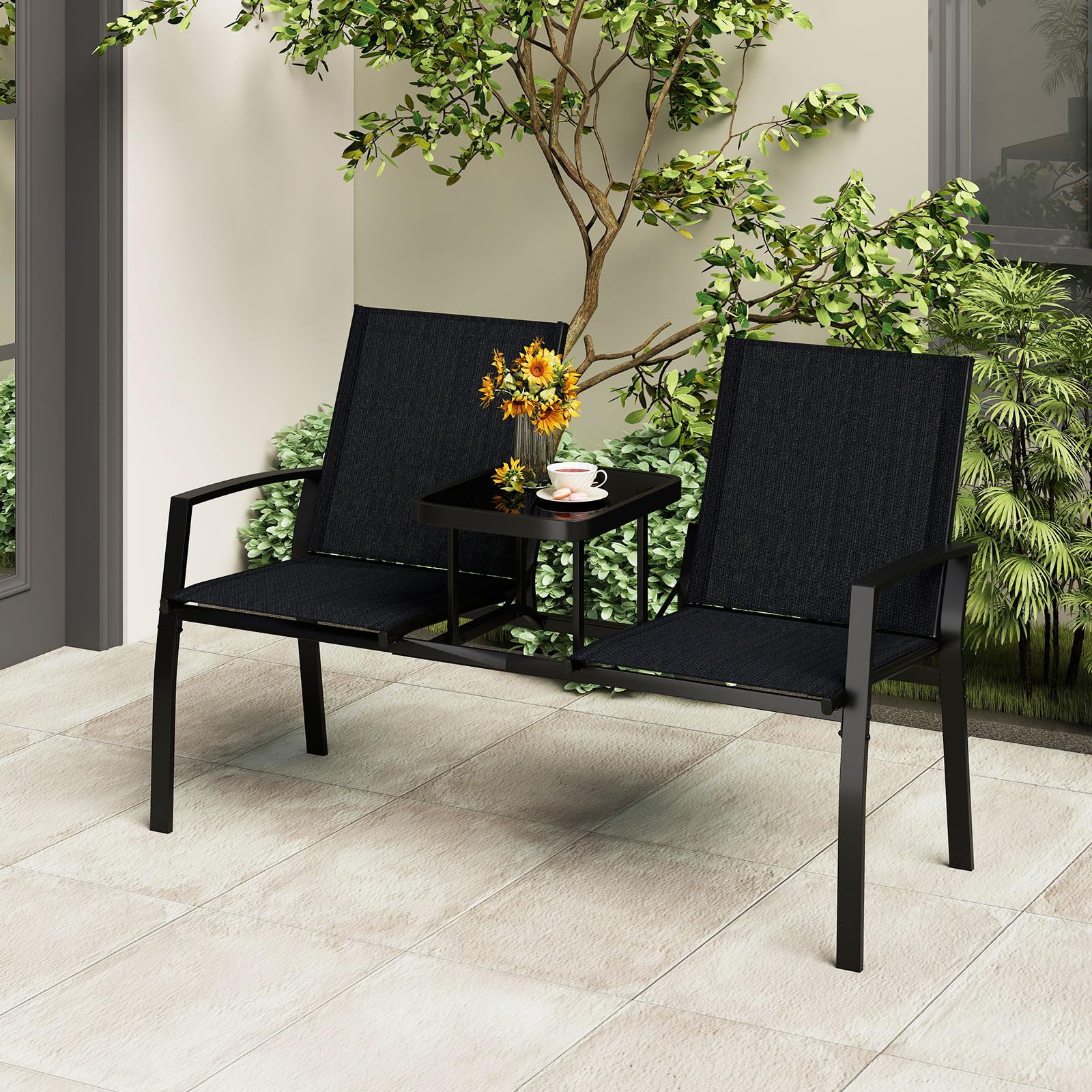 Featuring a sturdy metal frame, this outdoor loveseat provides reliable support and each seat supports up to 400 lbs. The breathable, quick-drying fabric ensures a comfortable seating experience even on warm days. As a cozy 2-seat porch chair, it includes ergonomic backrests and armrests that promote proper posture and ultimate comfort. Additionally, the built-in tempered glass table offers a sleek and convenient surface for placing your essentials. Versatile and elegant, this 2-person outdoor furniture seamlessly complements a variety of settings—from front porches to backyard patios.