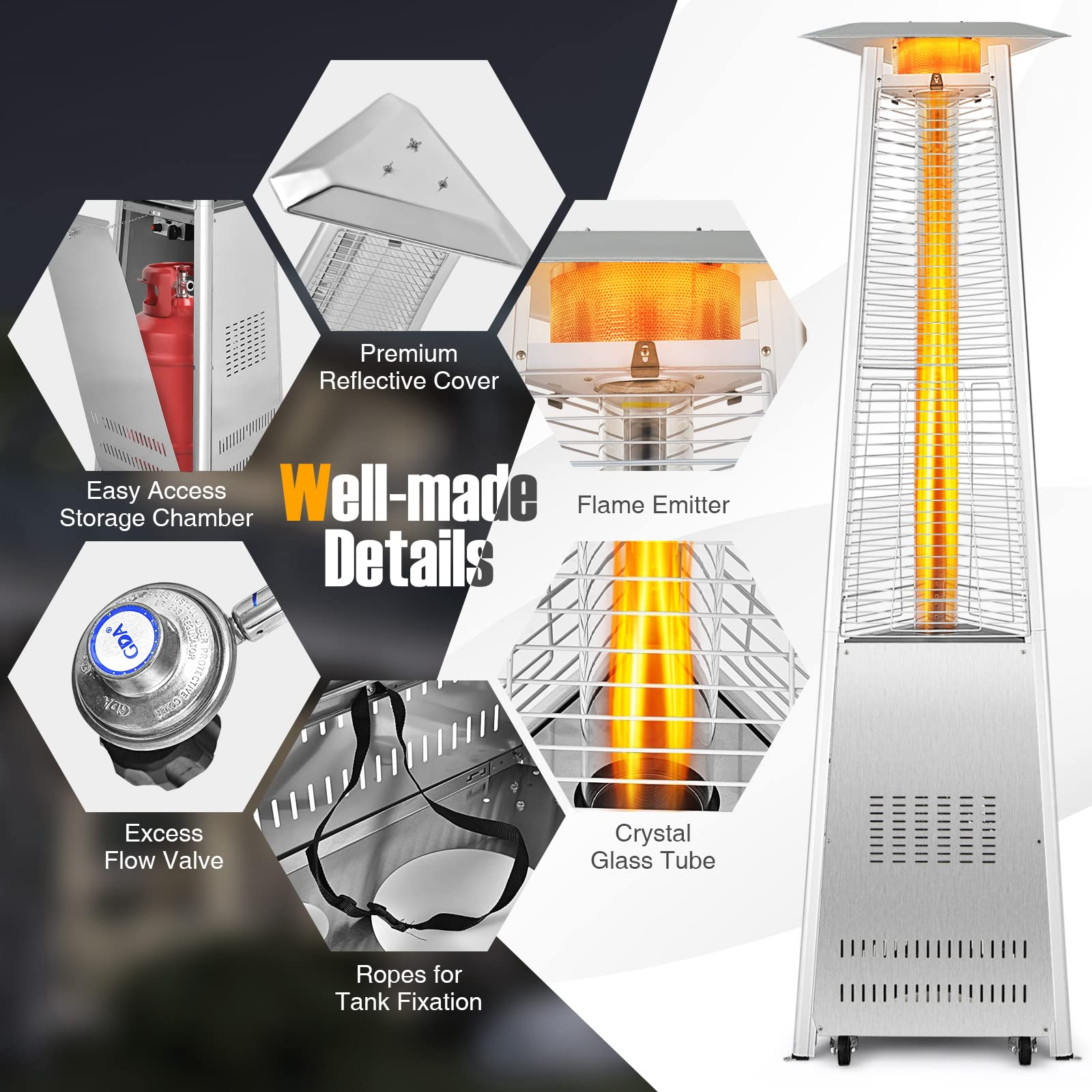 - 42,000 BTU Efficient Heating: Designed with 360-degree full-area heat dissipation, this 42,000 BTU pyramid outdoor heater not only provides effective heating but also warms up to a 215 sq. ft heating range. Therefore, you are able to enjoy outdoor gatherings even in the cold winter.