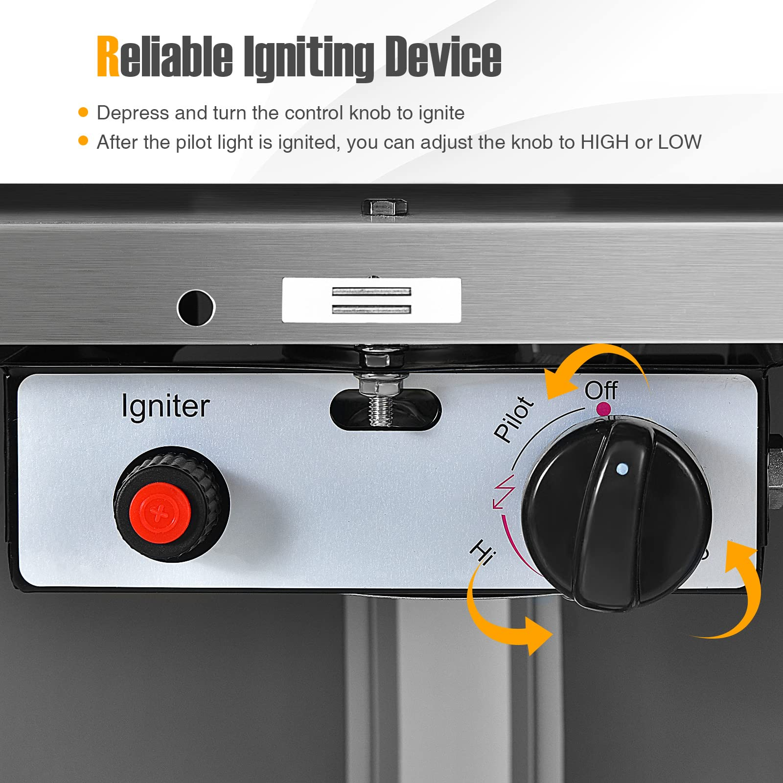- Quick Start Ignition System: The operation of this outdoor patio heater with an AA battery included is quite easy. There is a simple ignition system that hides behind the front panel. Through this system, you are able to quickly start this patio heater. And the low or high flame is available via a variable control knob.