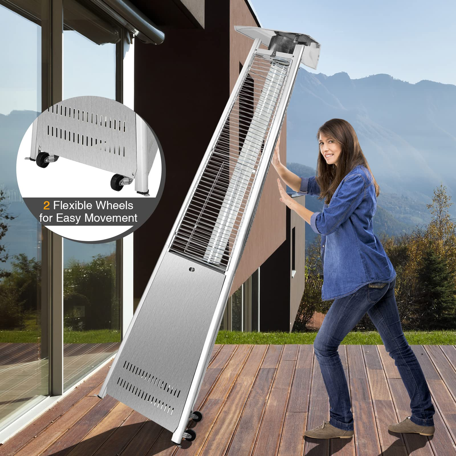 - Convenient Movement: This portable outdoor heater is equipped with 2 smooth wheels on the bottom so that you can move it to different outdoor places with ease. In addition, the high-quality stainless steel material and stable ground fixers make it stable and durable for outdoor use.