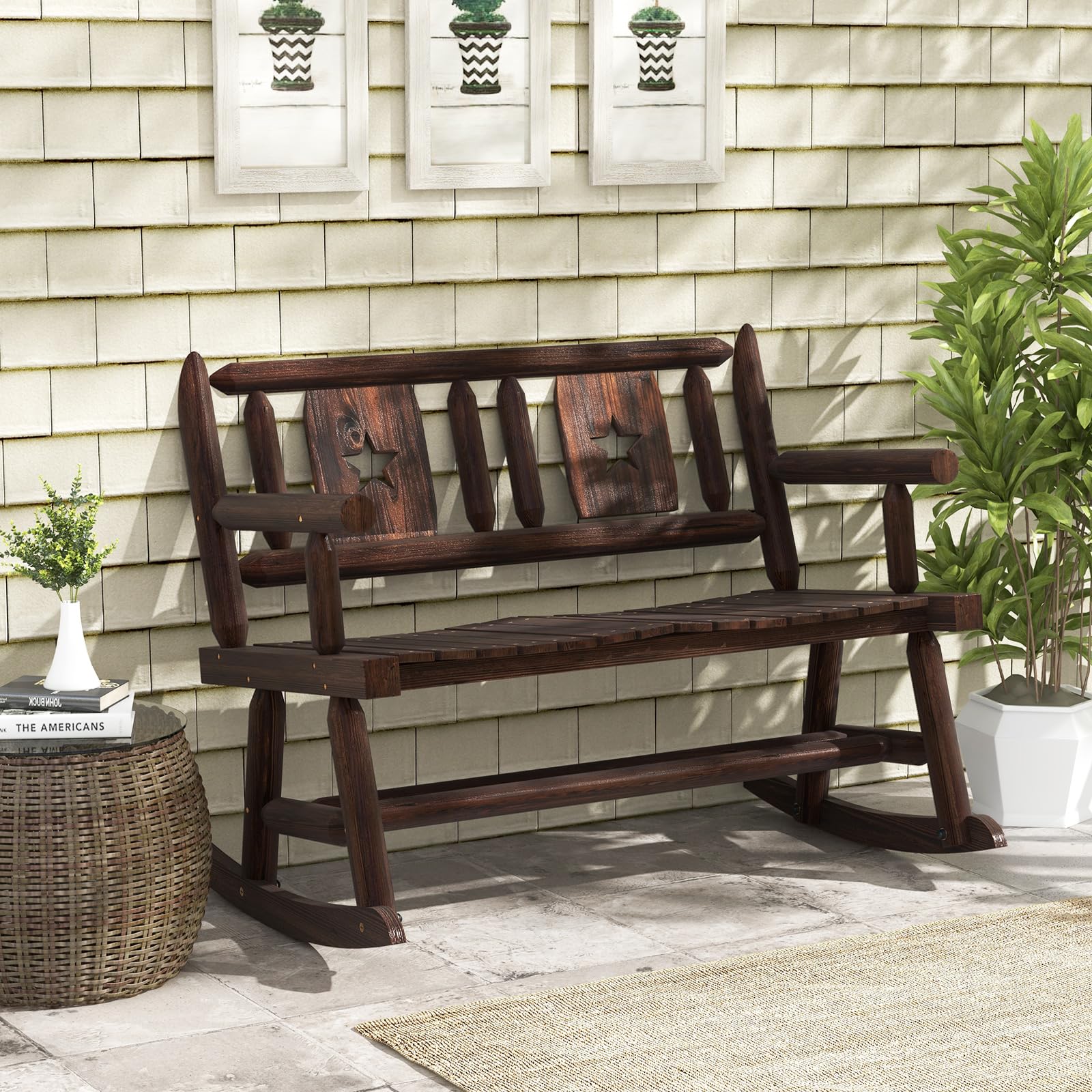 - Appealing Rustic Look: All in rustic brown, the rocking loveseat looks appealing. And the elegant patterns on the back make it more eye-catching. This premium 2-person rocking chair will be a perfect addition for backyard, porch, garden and so on.