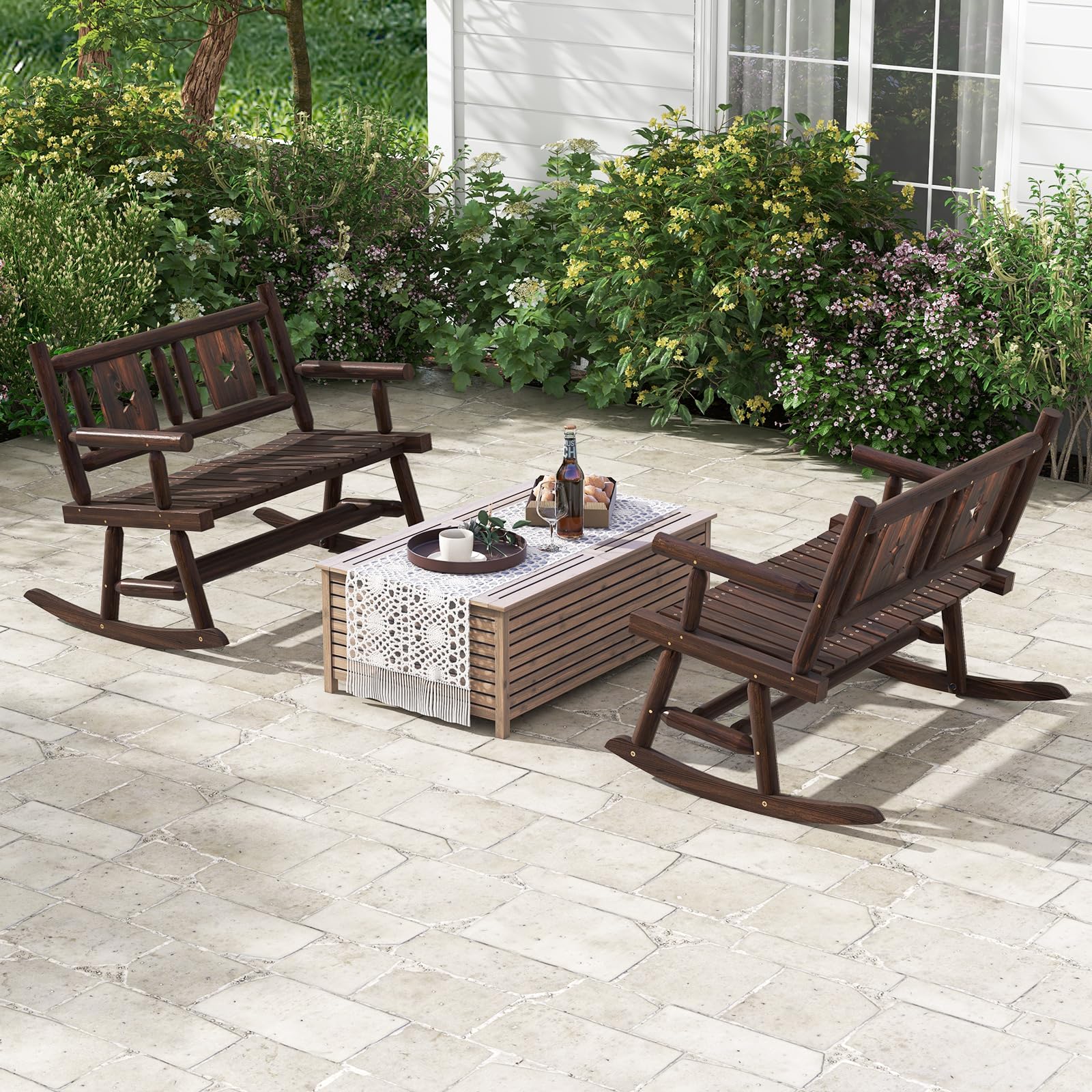This beautifully designed loveseat features a solid and sturdy rocking base, allowing for a 22° slight rocking motion that effectively relieves stress and pressure. Crafted with high-grade fir wood and pine wood with carbonized treatment, the loveseat can withstand long-time outdoor use. The ergonomic and wide seat, along with a 100° backrest, provide optimal comfort for you and your loved one. In a rustic brown finish with elegant patterns on the back, this 2-person rocking chair will be a perfect addition to your backyard, porch and garden.