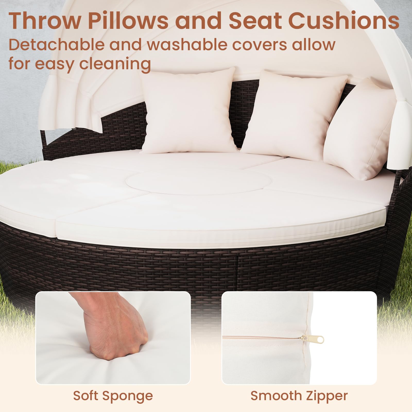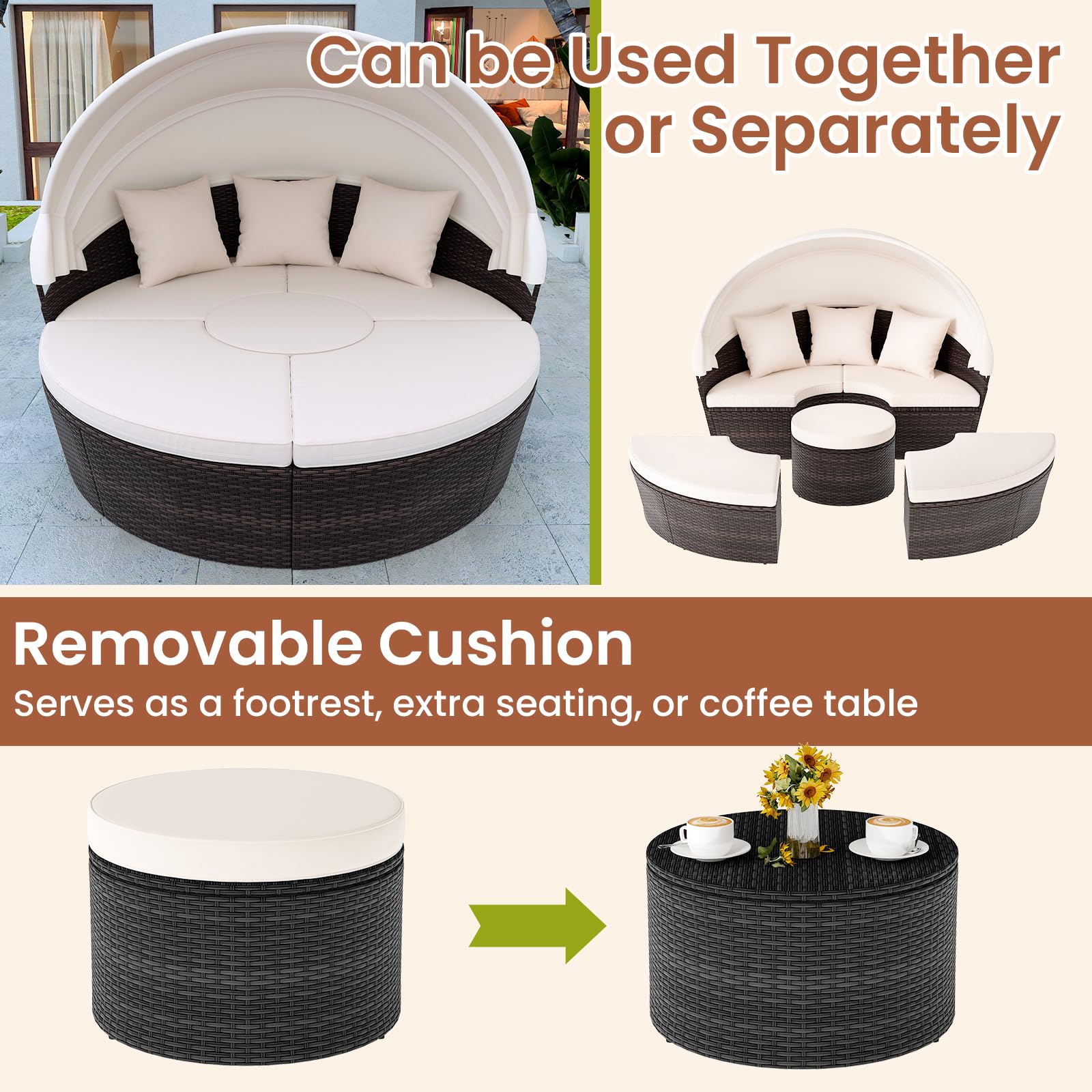 Made with hand-woven PE rattan, this outdoor patio sunbed combines durability and style. The adjustable canopy allows for customizable comfort, supported by a premium gas strut and secured with fixing ties. Moreover, the sturdy metal frame adds to its durability and stability. Including a bench, 2 chairs, and a center table, the sectional seating set can be used together or separately as you prefer. The 3 throw pillows and 4 seat cushions enhance comfort levels. Whether for your patio, yard, or poolside, this outdoor round daybed is a perfect choice.