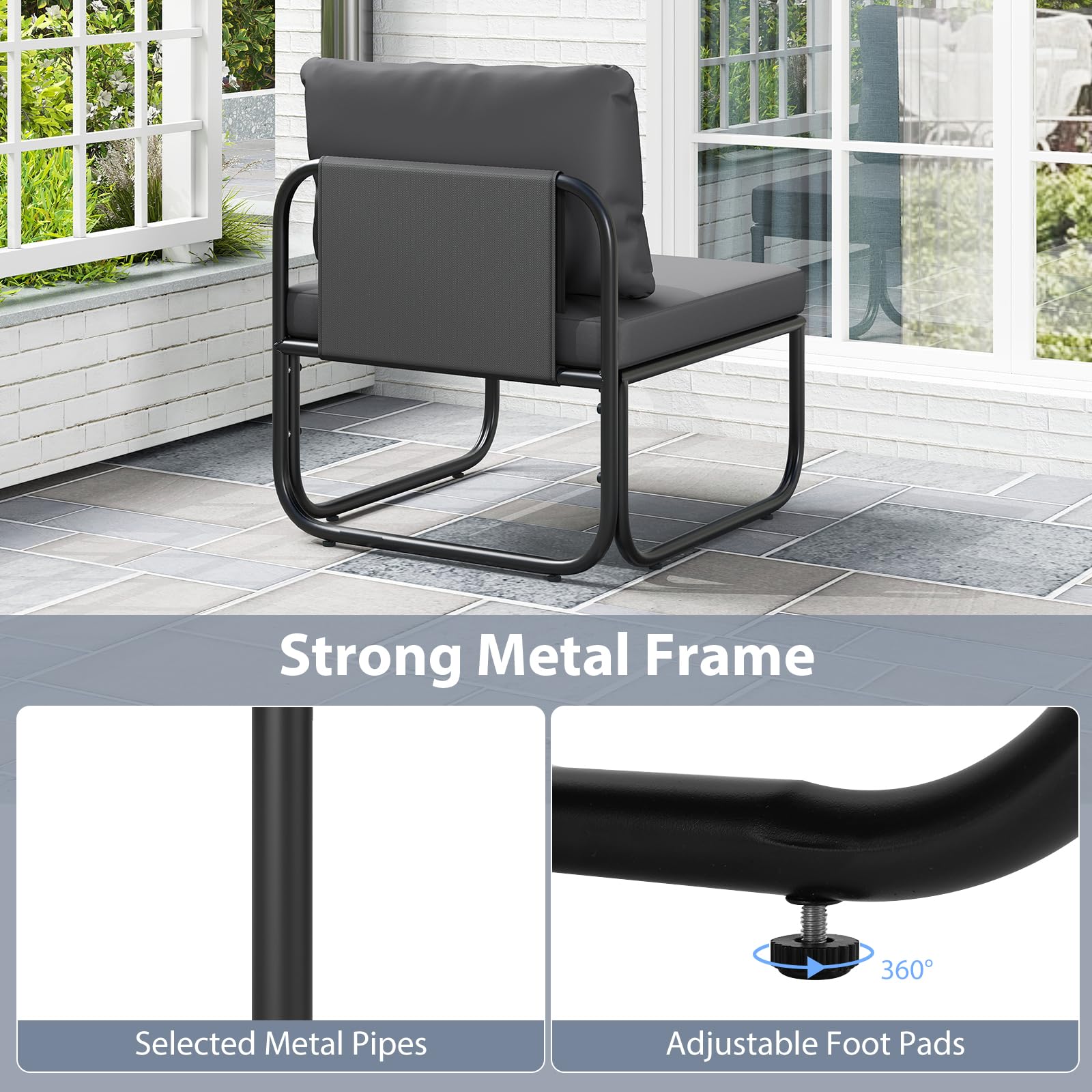 The backs and seats are covered with breathable and wear-resistant fabric. The sponge padded cushions ensure a comfortable sitting experience. The outdoor chairs are supported by solid metal frames for strong and sturdy support. Additionally, the adjustable foot pads allow for easy leveling on uneven surfaces. These patio chairs are the ideal addition to different outdoor places, including yards, porches, poolsides, gardens, and more. Please do not expose the chairs to rain to prolong their service life.