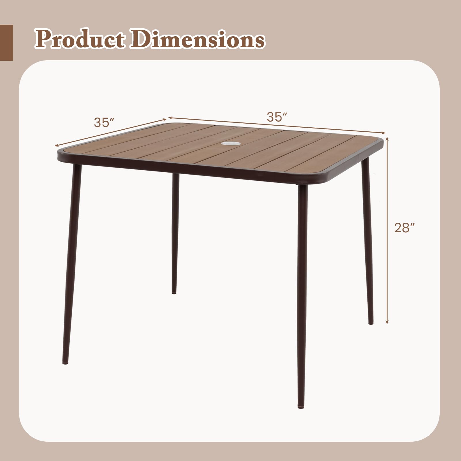 Featuring natural appearance and high functionality, the dining table promises both convenience and style. The umbrella hole in the middle allows you to relax under sunshade for more comfort. And the wood-plastic tabletop ensures extended outdoor use. Moreover, the patio table is supported by heavy-duty metal pipes for high stability. Make every meal memorable with this practical and nice patio dining table.