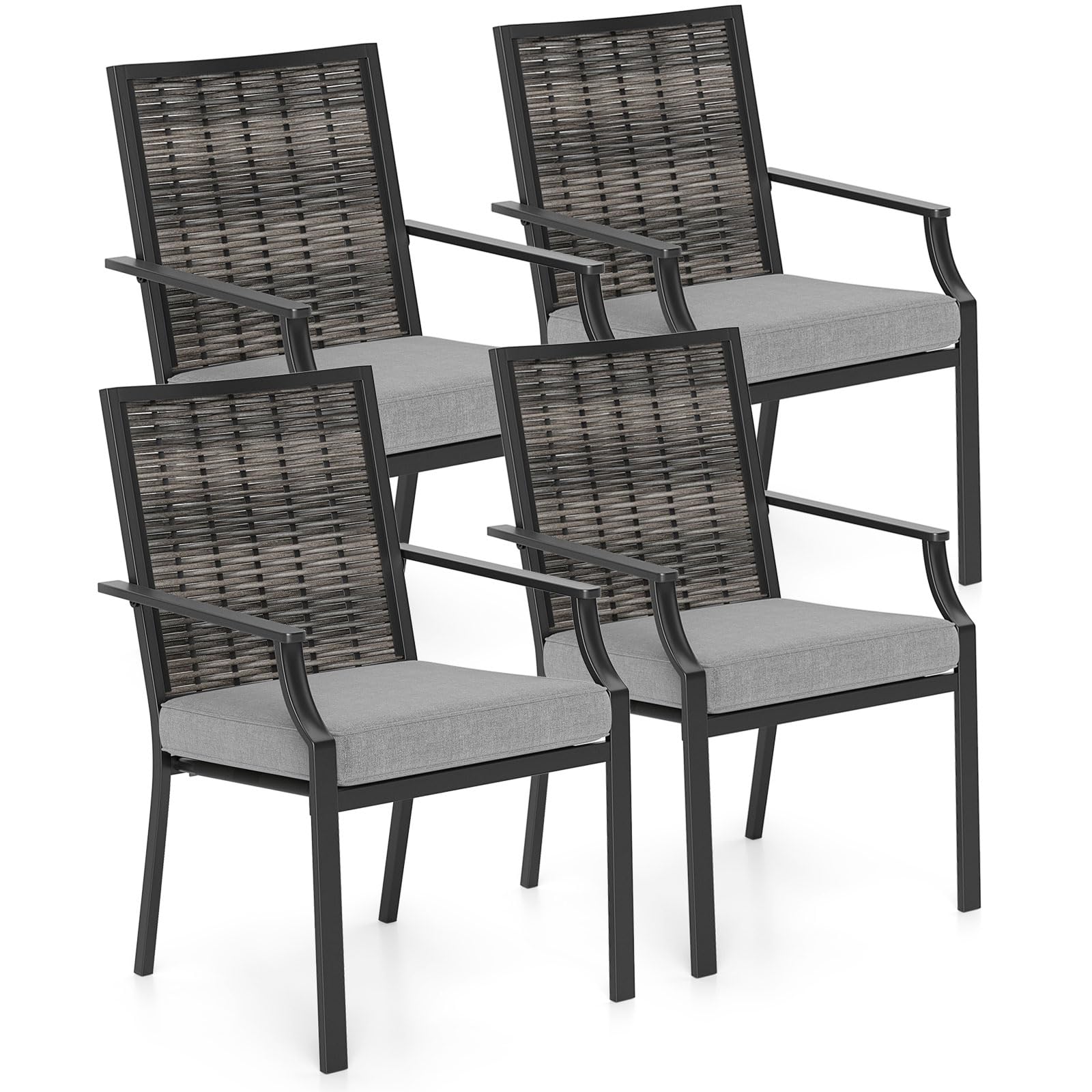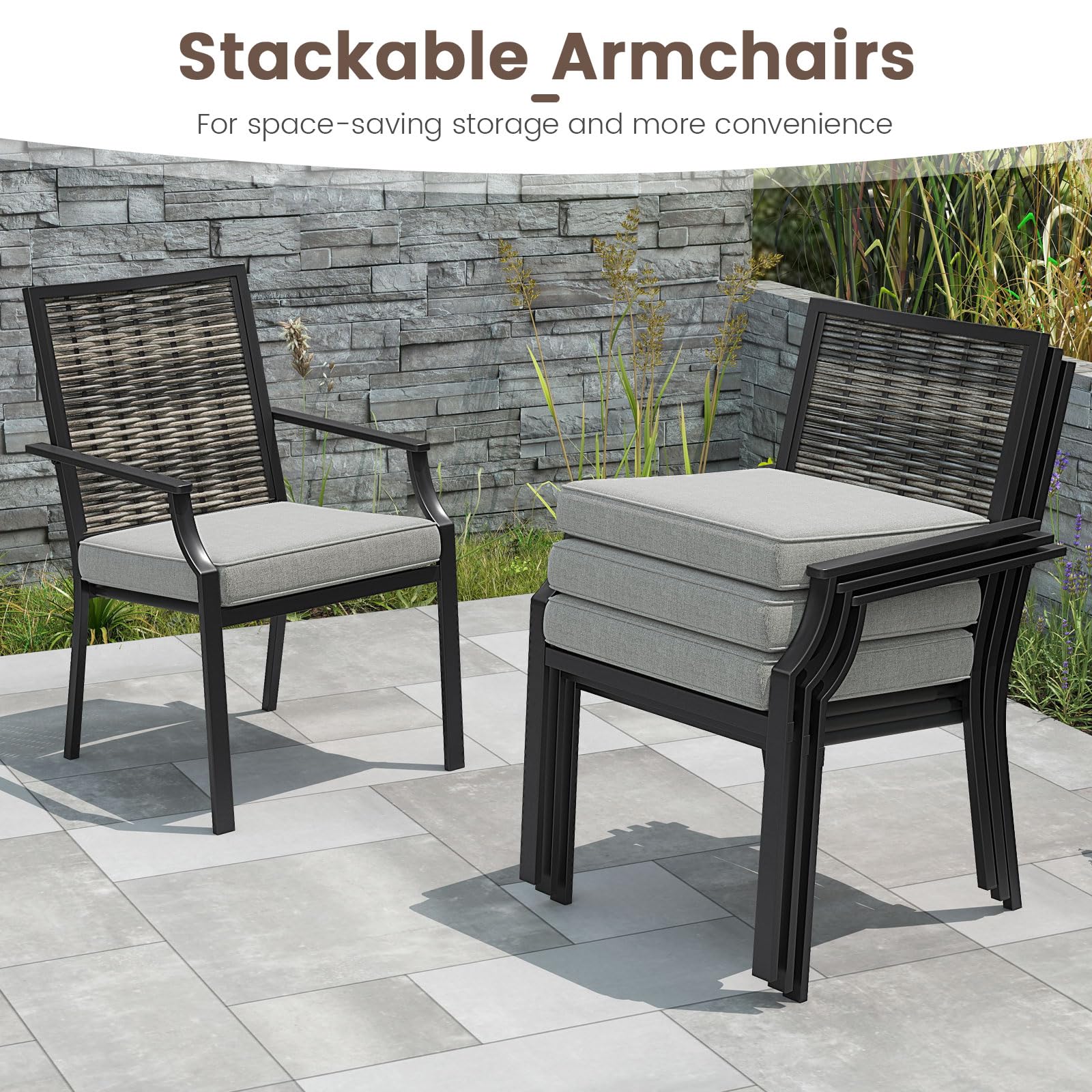 Each chair boasts a gracefully curved backrest crafted from hand-woven PE rattan, which is not only appealing but also sunproof and anti-fading. The chairs feature removable soft cushions with elastic sponge filling, secured firmly with hook and loop fasteners for optimal comfort. You can also remove these cushions, which is perfect for all-season use. The breathable seat fabric ensures that you won't feel sweaty in hot weather. Supported by heavy-duty frame, these rattan chairs ensure stability and safety. The stackable structure of the armchairs allows for easy storage, thus freeing up space for other activities when not in use. This set of wicker chairs with well-designed details is a stylish and practical addition to any outdoor area, merging functionality with comfort to transform your outdoor living experience.