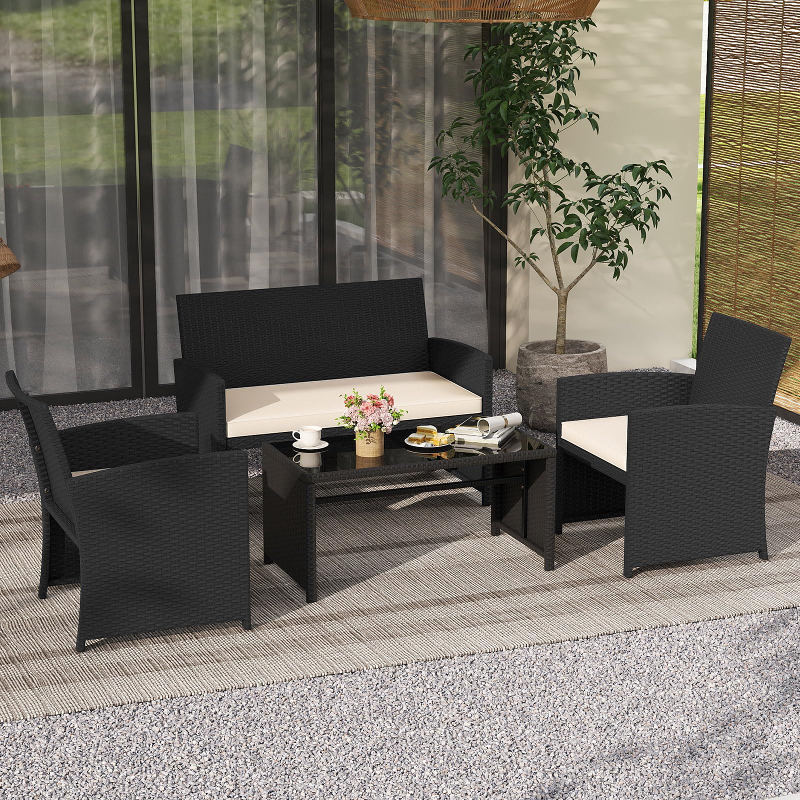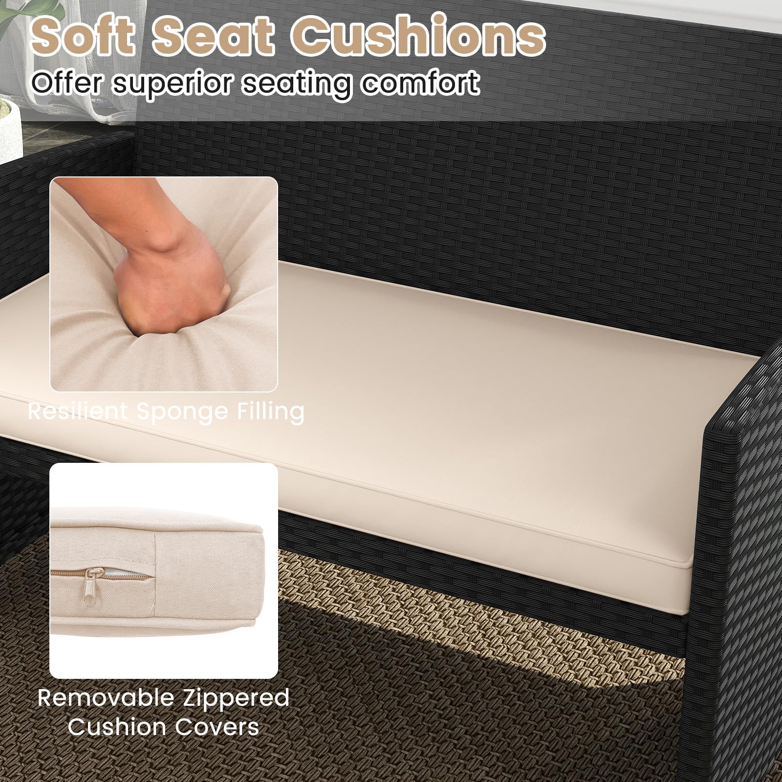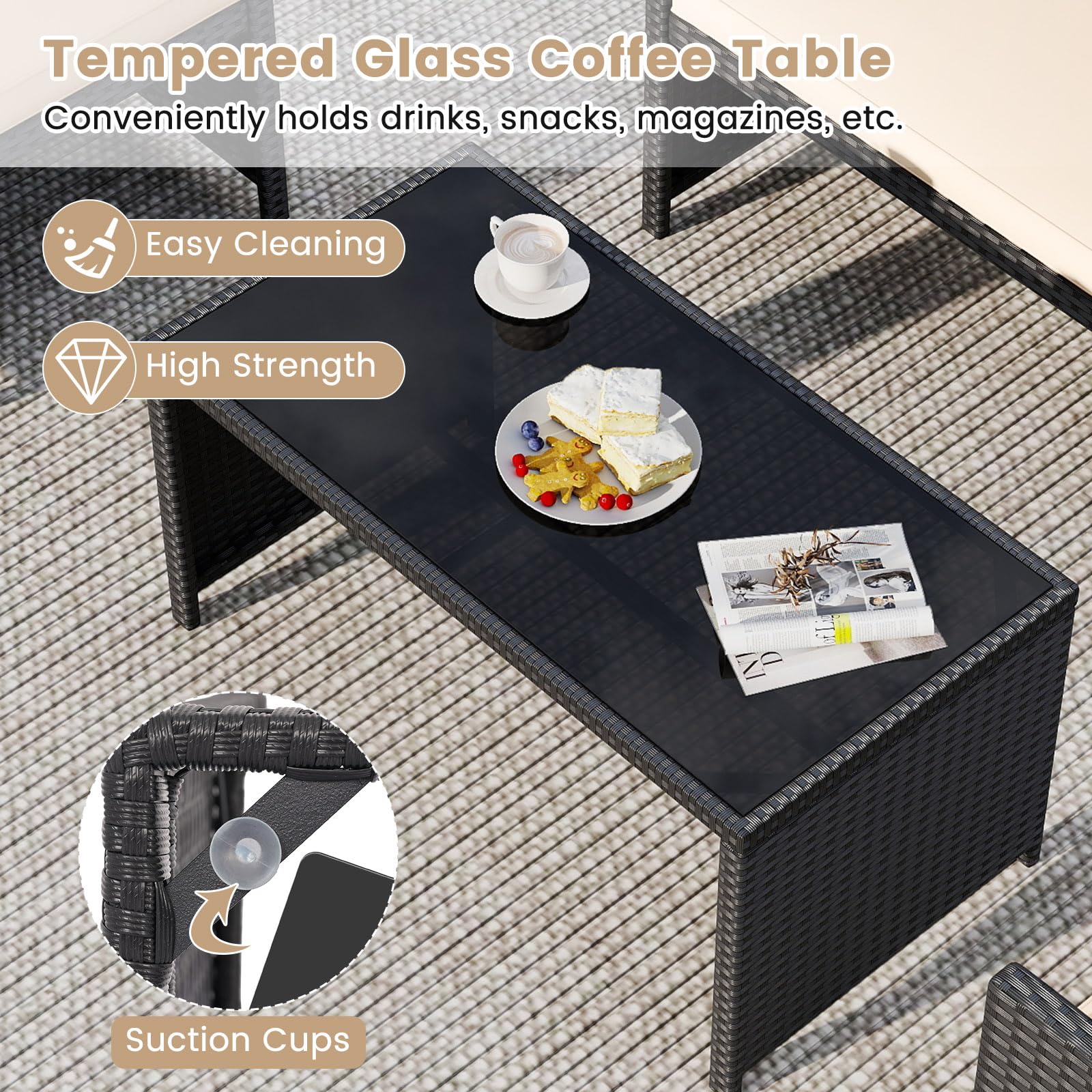 Material: PE Rattan, Tempered Glass, Metal, Polyester, Sponge