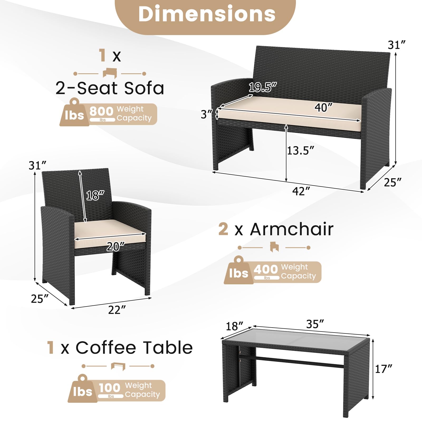Dimensions of 2-Seat Sofa: 25" x 42" x 31"/63 x 107 x 78 cm (L x W x H)