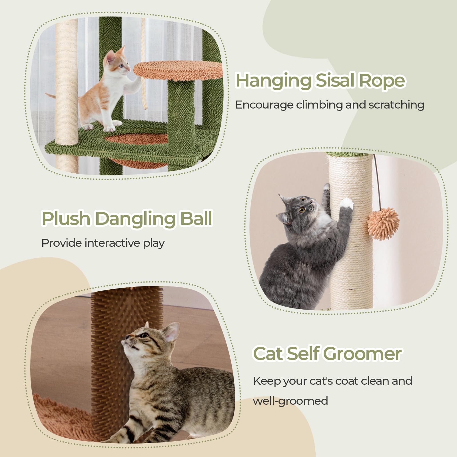 Our aesthetic cat tree measures 19.5” x 19” x 60”(L x W x H) and comes with 6 layers, offering your cat various levels to explore, lounge, and rest. It features soft moppy fabric covering with a striking combination of green and brown hues, complemented by lifelike artificial plants on the top, which creates a natural and inviting look that will seamlessly integrate into your home decoration. The cat tree also includes an observation top perch for lounging, 3 jumping platforms for playing, a snug hammock for peaceful naps. Not stopping there, the tree boasts natural sisal scratching posts for maintaining healthy claws, a dangling sisal rope for interactive playtime, a plush dangling ball for added amusement, and a cat self groomer for pampering sessions. Your cat will be kept entertained and mentally stimulated for hours on end! Stability is paramount with the large, sturdy base and anti-toppling device, providing a safe environment for your cat to play freely.