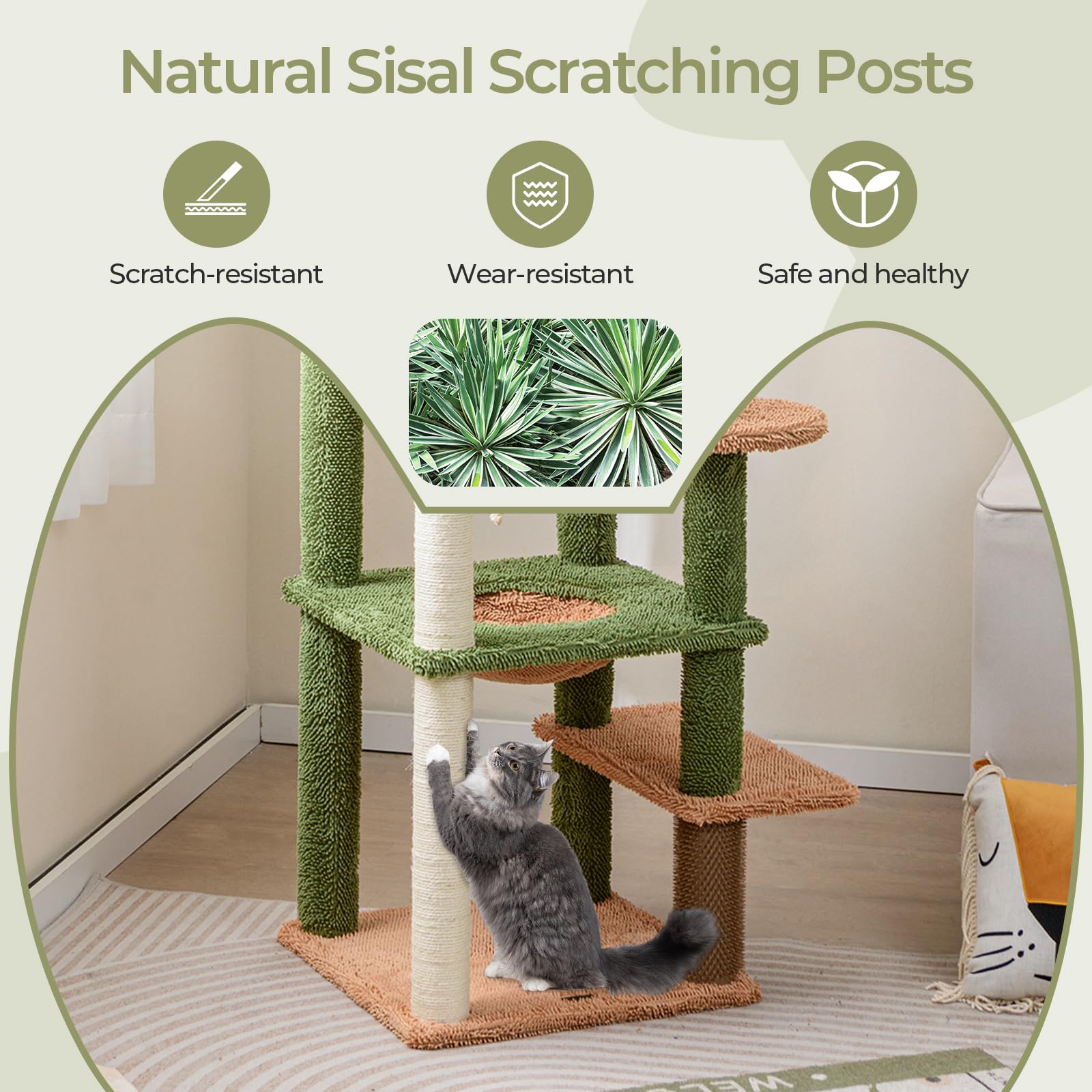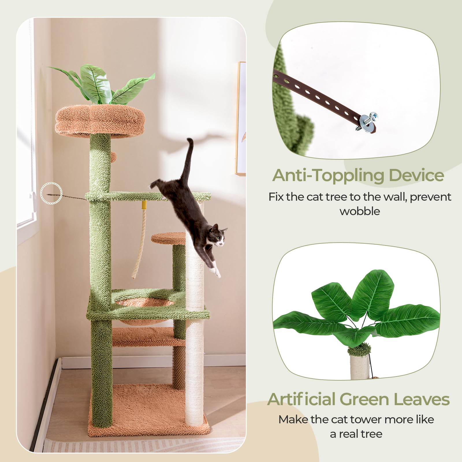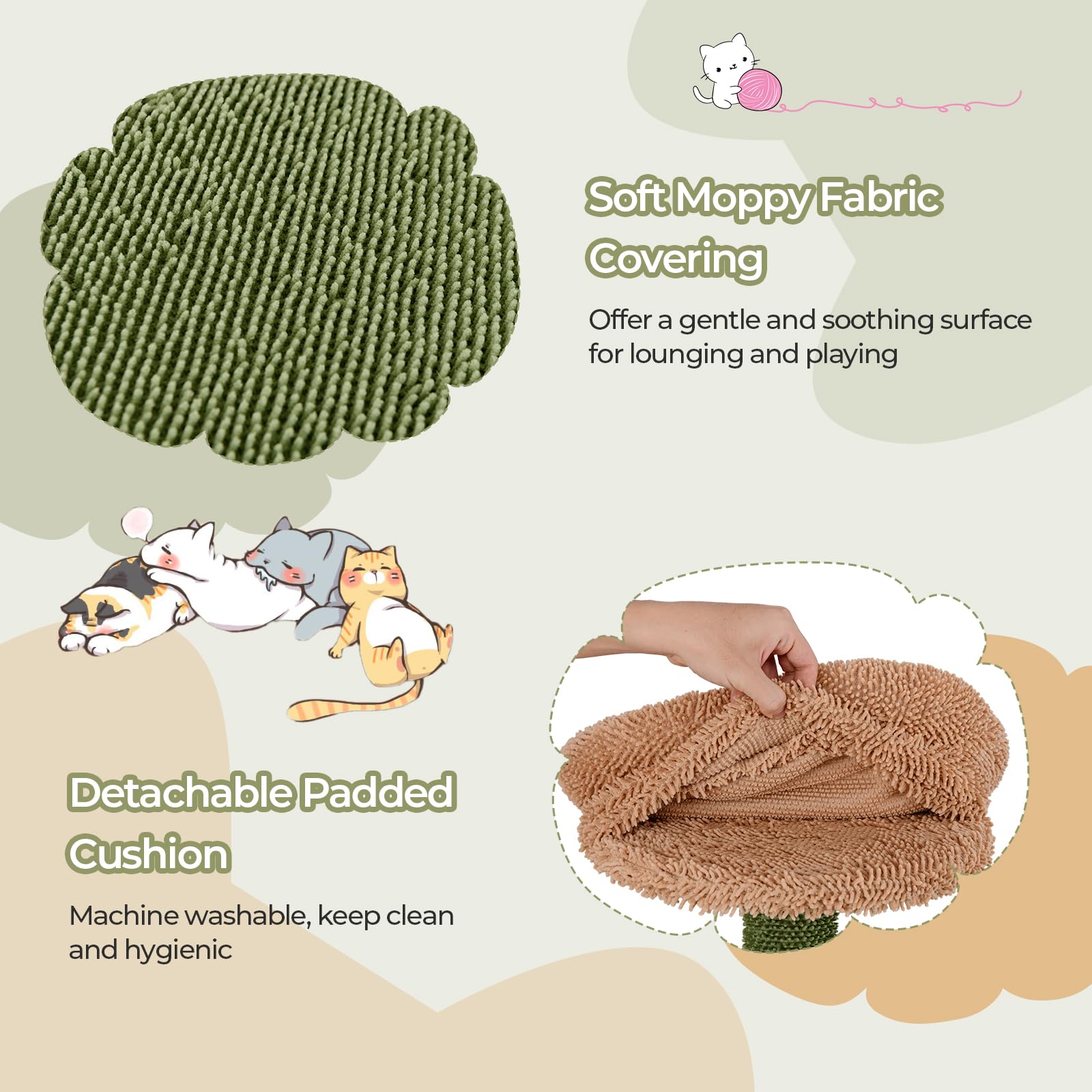 - Refreshing Botanical Styling: The aesthetic cat tree features a harmonious blend of green and brown colors, simulating real potted plants. Besides, the top is adorned with artificial green leaves, adding a touch of nature to your home decoration.