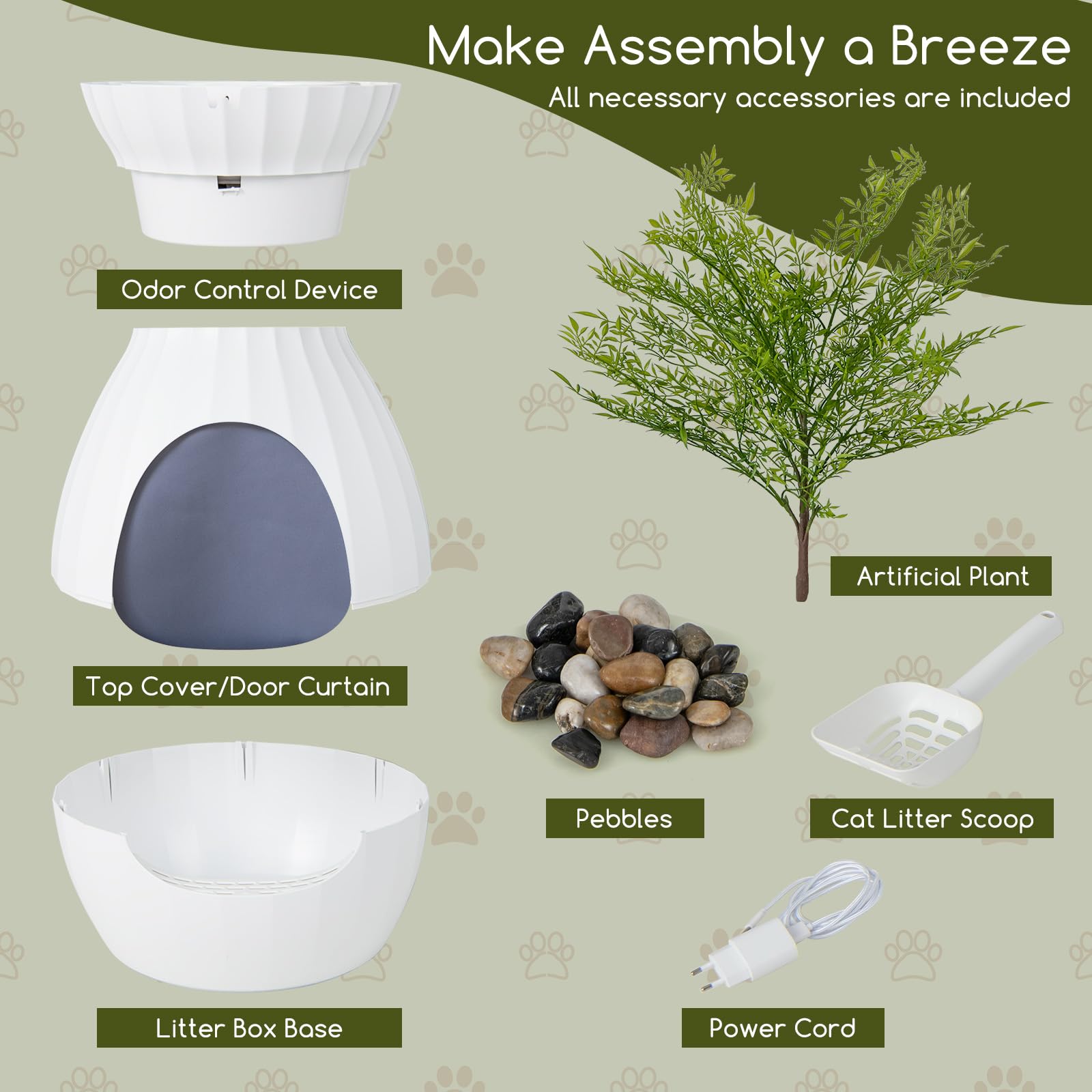 - Simple Assembly & Clean-up: The top cover and litter box base in 2 pieces make assembly a breeze. The litter box is ready just in minutes without any tool. The detachable door curtain provides privacy for your cats and blocks odor while the scoop allows for easy clean-up.