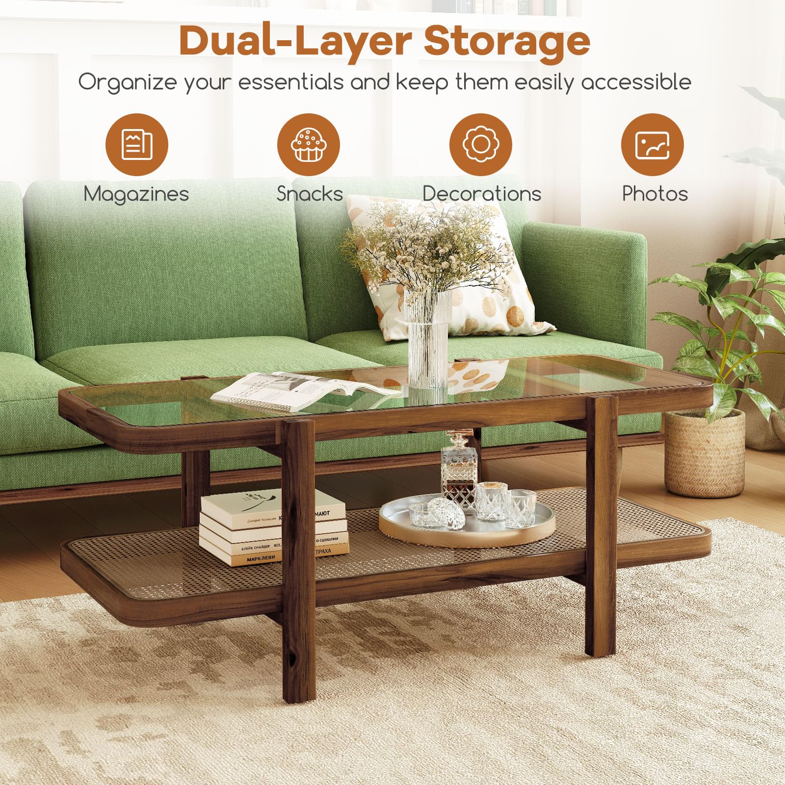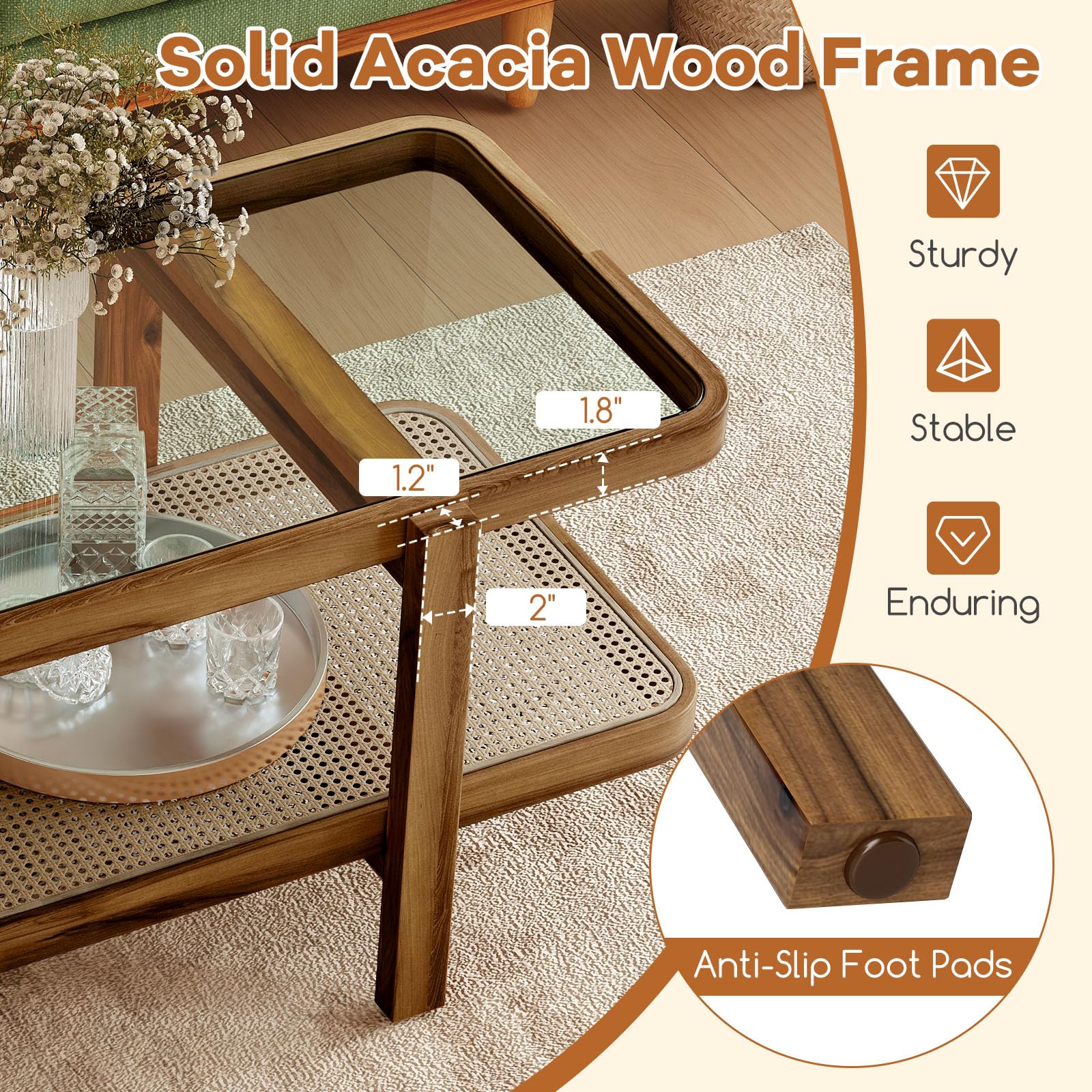 The rustic coffee table boasts a 2-tier design for ample storage space. Made of solid acacia wood, the sturdy structure supports up to 270 lbs, while anti-slip foot pads protect your floors. Its enduring tempered glass tabletop adds a touch of elegance and is easy to clean. In addition, the PE rattan shelf is both tear-proof and anti-fading, maintaining its quality over time. Perfect for various settings like offices or living rooms, this center table is a practical yet visually appealing addition to any space.