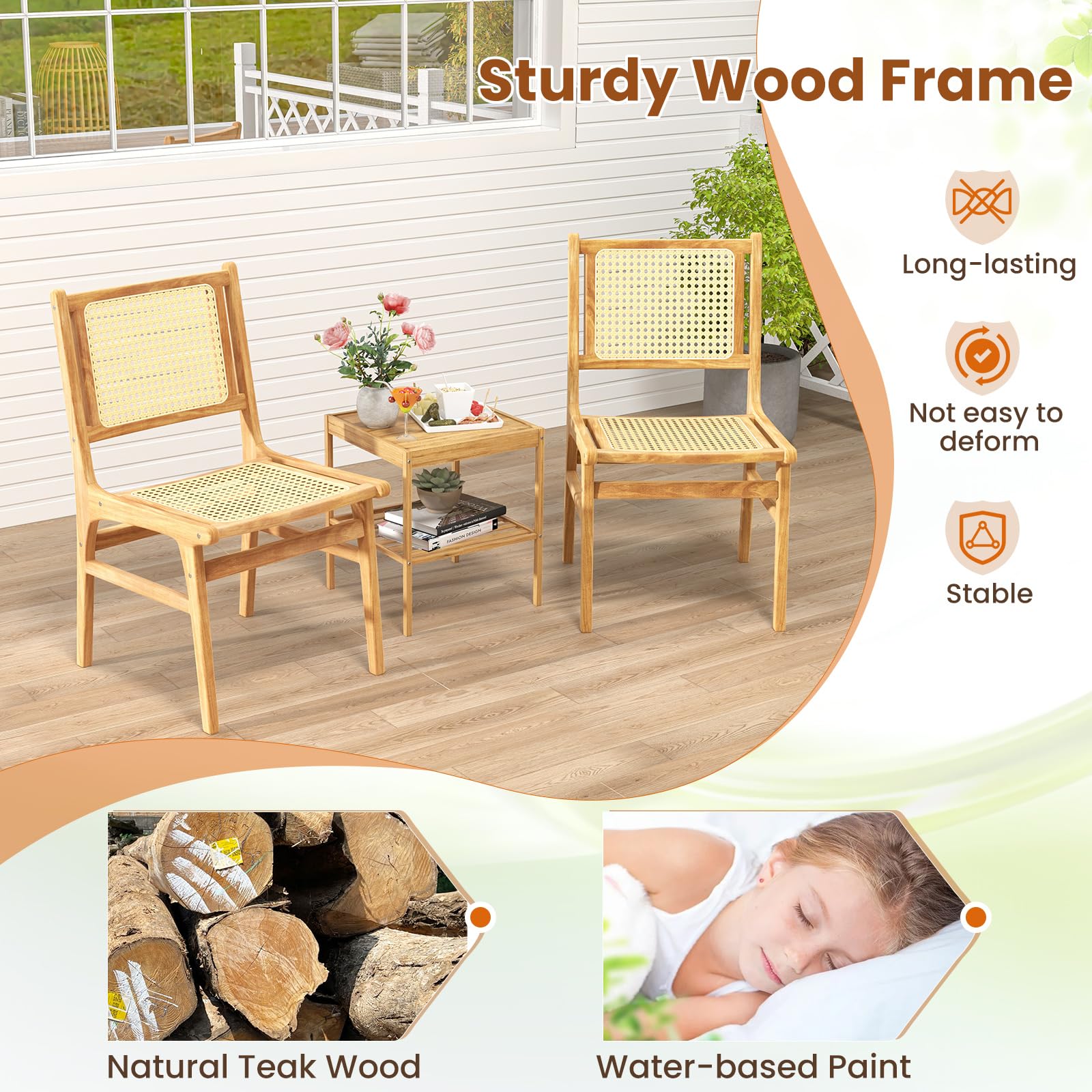 - Sturdy Wood Construction: Crafted from solid teak wood, the rattan dinette chair boasts high hardness and crack-resistance for long-lasting performance. Additionally, the reinforced H-shaped frame will increase the overall stability.